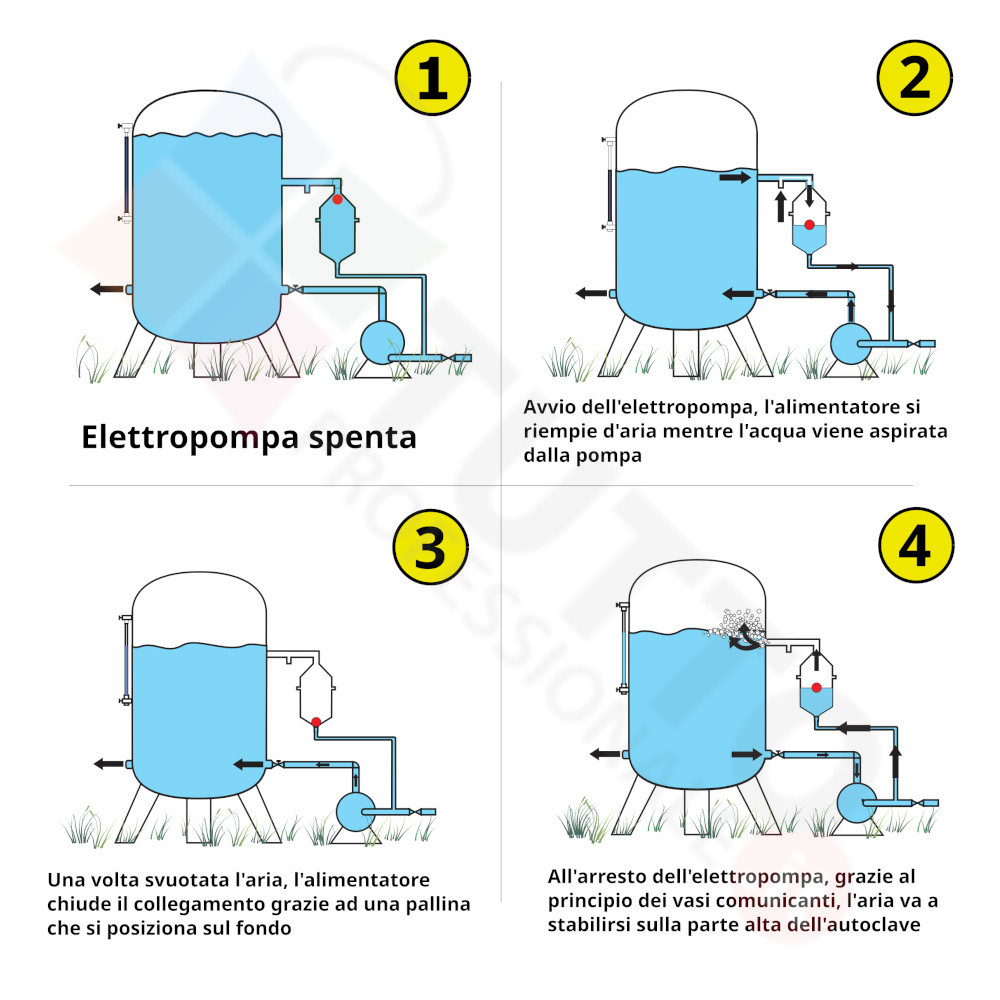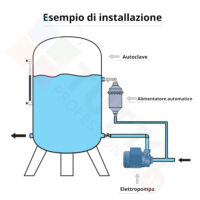 L’alimentatore automatico d’aria serve ad alimentare automaticamente il cuscino d’aria presente nelle autoclavi. Questo innovativo prodotto consente di stabilizzare il livello d’acqua nel punto dell’autoclave in cui esso viene posizionato. In aggiunta tramite l’impiego di un alimentatore d’aria Luise si evita l’installazione di compressori o di dispositivi simili, i quali oltre ad essere ben più costosi necessitano di manutenzione periodica. Il suo montaggio è semplicissimo, basterà collegarlo tra il vaso d’espansione ed il tubo che porta l’acqua alla pompa. Una volta azionata l’elettropompa, essa richiama l’acqua presente dentro l’alimentatore, che a sua volta ne richiama altra dall’autoclave. L’acqua passando attraverso l’ugello Venturi consente l’ingresso dell’aria dentro l’alimentatore fino al suo totale riempimento. Una volta che l’alimentatore è pieno d’aria, esso chiude il collegamento con l’elettropompa grazie ad una pallina presente al suo interno. Infine all’arresto dell’elettropompa, sfruttando il principio dei vasi comunicanti, l’aria dell’alimentatore va a stabilirsi dentro il punto più alto del vaso d’espansione. L’alimentatore automatico Luise Midi è idoneo per essere abbinato con vasi d’espansione da 500 litri a 2000 litri, è totalmente atossico ed è garantito per operare con una temperatura massima di esercizio di +50 °C. Per ulteriori informazioni consultare la scheda tecnica in allegato.