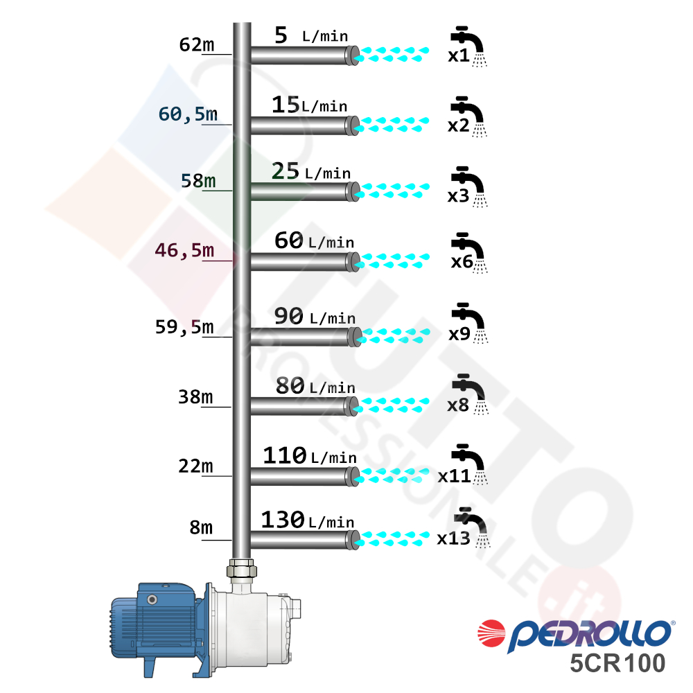 Questa elettropompa 43CR1005A serve a spingere l’acqua nell’impianto idrico. La pompa è realizzata da Pedrollo, una delle aziende leader nella produzione di elettropompe. Il modello 5CR 100 è un’elettropompa di superficie appartenente alla famiglia delle pompe centrifughe multigiranti silenziose. La pompa in questione grazie alla sua estrema affidabilità e silenziosità trova ottimo impiego per uso domestico, utile quindi per aumentare la pressione dell’acqua della vostra casa o altra abitazione e risulta indicata anche per il giardinaggio e quindi per irrigazione di orti, giardini, serre, prati ed altre applicazioni simili. La pompa è ideale quindi per aumentare la pressione in modo ottimale e costante, accoppiandola ad esempio ad alcuni presscontrol, piccoli serbatoi autoclavi o altri sistemi per il controllo della pressione da erogare.Essendo una pompa multigirante il rumore generato è molto basso, al suo interno troviamo più parti mobili dette giranti. Queste girando aspirando l’acqua dal tubo di aspirazione e trasferiscono all’acqua stessa l’energia generata dal loro movimento. Nel corpo pompa, dove si muove l’acqua spinta dalla forza generata dalle giranti, avviene l’aumento della pressione dell’acqua e viene espulsa con pressione elevata dalla bocca di uscita.Parlando della pompa centrifuga in questione precisiamo che va alimentata con una tensione trifase, ha una potenza in cavalli di 1,25 hp e la temperatura del liquido da pompare arriva fino a 40°C. Il corpo pompa è realizzato in ghisa ed internamente possiede girante e albero motore in acciaio inox, quindi tutti materiali particolarmente indicati per il corretto ed affidabile utilizzato dell’elettropompa, garantendo ottimo funzionamento e lunga durata nel tempo. L’installazione va effettuata in luoghi chiusi ben arieggiati o comunque protetti dalle intemperie in quanto la sua protezione certificata è di tipo IPX4.Per ulteriori informazioni tecniche consultare la scheda tecnica della pompa