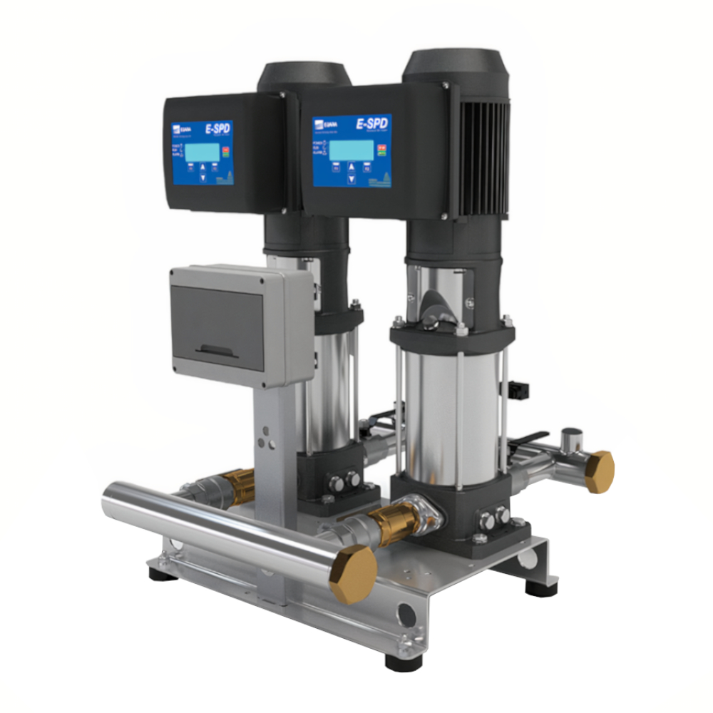 L’avviamento è gestito da due dispositivi intelligenti inverter doppi preinstallati su ogni pompa. Il modello E-SPD decideranno alternativamente e ordinatamente quale pompa deve essere avviata per prima in presenza di una domanda di flusso. Una volta che questa pompa inizia a girare ed in caso di arresto per mancanza di ulteriore domanda di flusso, il sistema avvierà una seconda pompa diversa dalla prima nell’avvio successivo. Quindi scambia l’ordine di avviamento delle pompe ad ogni richiesta, quindi appena verrà aperto un rubinetto o un qualsiasi dispositivo che abbia bisogno di acqua, il quadro intelligente azionerà le pompe in base all’esigenza e alla quantità di acqua che serve. Viene utilizzato per approvvigionamento idrico per reti di distribuzione inerenti al settore industriale o domestico, irrigazione di giardini, parchi, campi sportivi e altre applicazioni simili. La struttura è realizzata da collettori in acciaio zincato, con valvola di intercettazione sul lato di aspirazione e di mandata di ogni pompa.