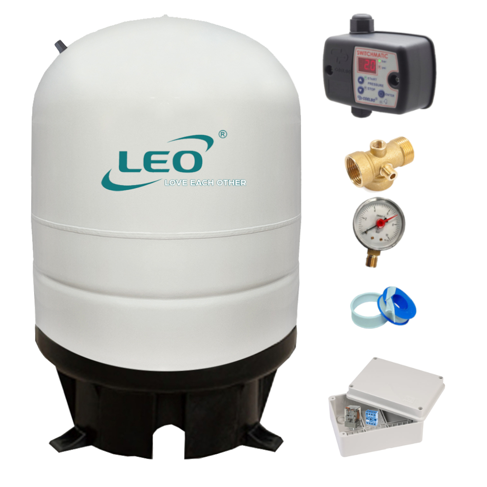 Il kit con il pressostato elettronico SwitchMatic è la soluzione perfetta per porre fine ai vostri problemi di pressione e regolazione del vostro impianto. La sua funzione è di accendere e spegnere la vostra elettropompa ad una pressione precisa che va da 1 a 8 bar per l’arresto e da 0,5 ÷ 7 bar per l’avviamento. Tutte le sue regolazioni e impostazioni vengono effettuare tramite semplice pannello di controllo posto sul fronte del presscontrol. Il montaggio è molto semplice in quanto basta avvitare il pressostato ad una semplice tes a 5 vie inclusa ad esempio di manometro e altri accessori, per poi effettuare il cablaggio. Questo si fa in modo analogo a quello di un pressostato come square D tradizionale. Tra le sue caratteristiche funzionali più importanti troviamo il modo stand-by, che garantisce un basso consumo di potenza, manometro interno con indicatore digitale, funzione ART (Automatic Reset Test) dove il dispositivo va a spegnersi in caso di mancanza d’acqua, andrà poi a controllare con una periodicità programmata se l’acqua è presente e solo in quel caso il pressostato riprenderà il suo lavoro e l’allarme di ciclo rapido: quando il serbatoio idropneumatico ha perso aria e si producono frequenti arresti ed avvii, si attiva un allarme. Grazie al vaso espansione le accensioni però non saranno molto frequenti, in quanto immagazzinerà l’acqua riducendo accensioni dell’elettropompa. Nel kit inoltre viene fornito una comoda scatola con un relè ausiliario da 10A per pompe trifase fino a 5hp. I vaso espansione per acqua pulita LEO LEO-100LX-PW è usato negli impianti di casa o industriali per acqua potabile e riscaldamento. L’idrosfera con membrana sarà indispensabile per contenere le variazioni improvvise di pressione del circuito evitando sbalzi e colpi d’ariete, dove verranno evitando che vengano assorbiti dall’impianto.