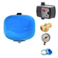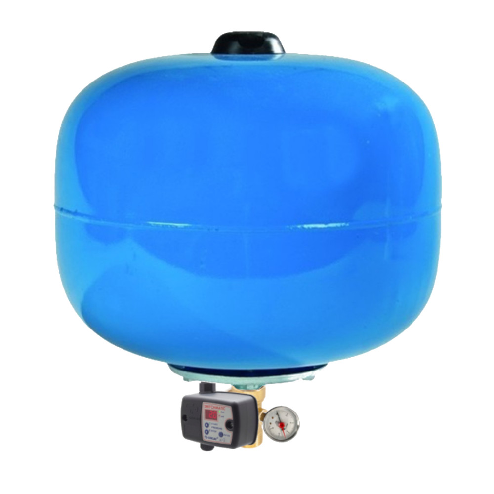 Il kit con il pressostato elettronico SwitchMatic è la soluzione perfetta per porre fine ai vostri problemi di pressione e regolazione del vostro impianto. La sua funzione è di accendere e spegnere la vostra elettropompa ad una pressione precisa che va da 1 a 8 bar per l’arresto e da 0,5 ÷ 7 bar per l’avviamento. Tutte le sue regolazioni e impostazioni vengono effettuare tramite semplice pannello di controllo posto sul fronte del presscontrol. Il montaggio è molto semplice in quanto basta avvitare il pressostato ad una semplice tes a 5 vie inclusa ad esempio di manometro e altri accessori, per poi effettuare il cablaggio. Questo si fa in modo analogo a quello di un pressostato come square D tradizionale. Tra le sue caratteristiche funzionali più importanti troviamo il modo stand-by, che garantisce un basso consumo di potenza, manometro interno con indicatore digitale, funzione ART (Automatic Reset Test) dove il dispositivo va a spegnersi in caso di mancanza d’acqua, andrà poi a controllare con una periodicità programmata se l’acqua è presente e solo in quel caso il pressostato riprenderà il suo lavoro. Presente anche l’allarme di ciclo rapido: quando il serbatoio idropneumatico ha perso aria e si producono frequenti arresti ed avvii, si attiva un allarme. Grazie al vaso espansione le accensioni però non saranno molto frequenti, in quanto immagazzinerà l’acqua riducendo accensioni dell’elettropompa. I vaso espansione per acqua pulita da 24 litri è usato negli impianti di casa o industriali per acqua potabile e riscaldamento. L’idrosfera con membrana sarà indispensabile per contenere le variazioni improvvise di pressione del circuito evitando sbalzi e colpi d’ariete, dove verrà evitato che vengano assorbiti dall’impianto.