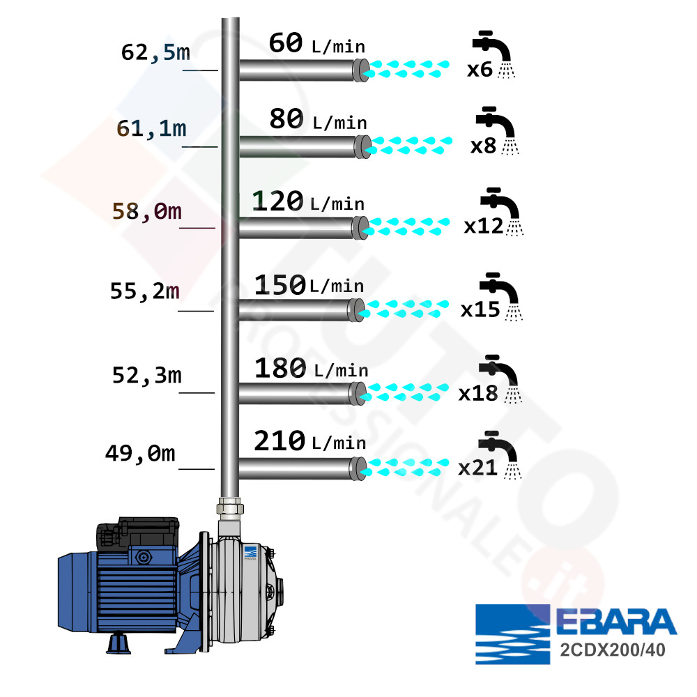 La pompa 2CDX realizzata dalla rinomata azienda EBARA, si differenzia di molto da una classica pompa autoclave. Sostanzialmente è composta da 2 giranti radiali completamente in acciaio INOX AISI 316. Le due giranti interne vanno ad aspirare l’acqua dal tubo di aspirazione e trasferiscono all’acqua stessa l’energia generata dal loro movimento. Nel corpo pompa, dove si muove l’acqua spinta dalla forza generata dalle giranti, avviene l’aumento della pressione dell’acqua e viene espulsa con pressione elevata dalla bocca di uscita. Garantisce elevati rendimenti e adattabilità alle più svariate applicazioni. Viene utilizzata nel settore domestico e in particolare per la distribuzione dell’acqua in accoppiamento con sistemi come serbatoi, autoclave, presscontrol o altri sistemi per il controllo della pressione da erogare. Nulla toglie che possa essere usata anche per irrigazione e giardinaggio.