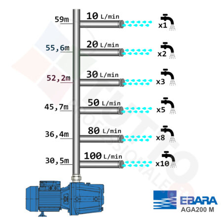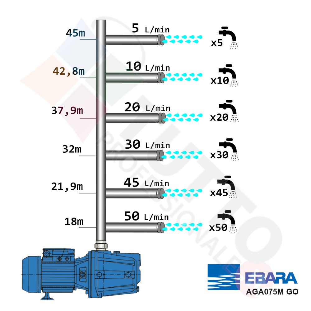 Questa elettropompa serve a spingere l’acqua nell’impianto idrico. Le elettropompe AGA75 M sono ideate e realizzate da EBARA. Sono utilizzate esclusivamente per pompare acqua pulite e chimicamente non aggressive. Trova vasto impiego nell’uso domestico, utilizzata per aumentare la pressione dell’acqua della vostra casa o altra abitazione, per il giardinaggio e quindi per irrigazione di orti, giardini, serre, prati ed altre applicazioni simili. La pompa è ideale quindi per aumentare la pressione in modo ottimale e costante, accoppiandola ad esempio ad alcuni presscontrol, piccoli serbatoi autoclavi o altri sistemi per il controllo della pressione da erogare. La pompa autoadescante ha la particolarità di aspirare l’aria contenuta nel tubo di aspirazione, questo accade grazie al movimento rotatorio della giranti che creano una forte turbolenza nel liquido contenuto all’interno del corpo pompa, e genera a sua volta una depressione risucchiando l’aria in essa contenuta. La girante al suo interno mentre è in funzione aspira l’acqua dal tubo di aspirazione e trasferiscono all’acqua stessa l’energia generata dal loro movimento. Nel corpo pompa, dove si muove l’acqua spinta dalla forza generata dalla girante, avviene l’aumento della pressione dell’acqua e viene espulsa con pressione elevata dalla bocca di uscita.
