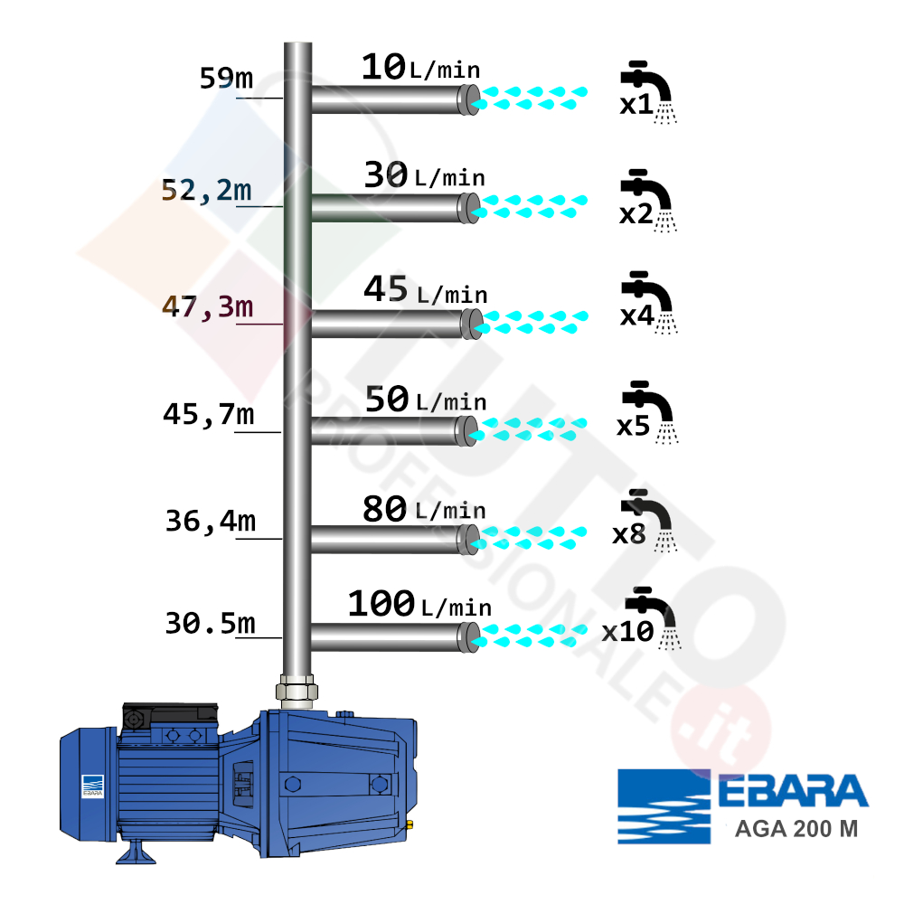 Questa elettropompa serve a spingere l’acqua nell’impianto idrico. Le elettropompe AGA 200 T sono ideate e realizzate da EBARA. Sono utilizzate esclusivamente per pompare acqua pulite e chimicamente non aggressive. Trova vasto impiego nell’uso domestico, utilizzata per aumentare la pressione dell’acqua della vostra casa o altra abitazione, per il giardinaggio e quindi per irrigazione di orti, giardini, serre, prati ed altre applicazioni simili. La pompa è ideale quindi per aumentare la pressione in modo ottimale e costante, accoppiandola ad esempio ad alcuni presscontrol, piccoli serbatoi autoclavi o altri sistemi per il controllo della pressione da erogare. La pompa autoadescante ha la particolarità di aspirare l’aria contenuta nel tubo di aspirazione, questo accade grazie al movimento rotatorio della giranti che creano una forte turbolenza nel liquido contenuto all’interno del corpo pompa, e genera a sua volta una depressione risucchiando l’aria in essa contenuta. La girante al suo interno mentre è in funzione aspira l’acqua dal tubo di aspirazione e trasferiscono all’acqua stessa l’energia generata dal loro movimento. Nel corpo pompa, dove si muove l’acqua spinta dalla forza generata dalla girante, avviene l’aumento della pressione dell’acqua e viene espulsa con pressione elevata dalla bocca di uscita.
