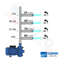 Questa elettropompa serve a spingere l’acqua nell’impianto idrico. La pompa CDA 75 è realizzata dalla rinomata azienda Ebara, è un’elettropompa centrifuga bigirante di superficie utilizzata per pompare acqua pulita. Garantisce elevati rendimenti e adattabilità alle più svariate applicazioni. Viene utilizzata nel settore domestico, civile, industriale e in particolare per la distribuzione dell’acqua in accoppiamento con sistemi come serbatoi, autoclave, presscontrol o altri sistemi per il controllo della pressione da erogare. Il suo funzionamento avviene grazie ad una doppia girante interna che girando vanno ad aspirare l’acqua dal tubo di aspirazione e trasferiscono all’acqua stessa l’energia generata dal loro movimento. Nel corpo pompa, dove si muove l’acqua spinta dalla forza generata dalle giranti, avviene l’aumento della pressione dell’acqua e viene espulsa con pressione elevata dalla bocca di uscita. Questa pompa bigirante centrifuga funziona grazie alla tensione monofase, ha una potenza in cavalli di 0,75hp e la temperatura del liquido da pompare massima è di 90 °C. Il corpo pompa è realizzato in ghisa ed internamente possiede girante in PPE rinforzata con fibre di vetro e albero motore in acciaio inox, quindi tutti materiali particolarmente indicati per il corretto ed affidabile utilizzato dell’elettropompa, garantendo ottimo funzionamento e lunga durata nel tempo. L’installazione va effettuata in luoghi chiusi ben arieggiati o comunque protetti dalle intemperie in quanto la sua protezione certificata è di tipo IP44.Per ulteriori informazioni tecniche consultare la scheda tecnica della pompa.