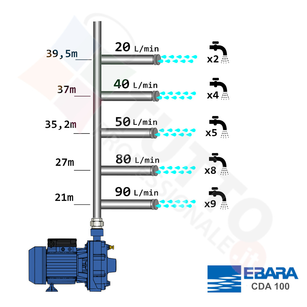 Questa elettropompa serve a spingere l’acqua nell’impianto idrico. La pompa CDA/I 100 I è realizzata dalla rinomata azienda Ebara, è un’elettropompa centrifuga bigirante di superficie utilizzata per pompare acqua pulita. Garantisce elevati rendimenti e adattabilità alle più svariate applicazioni. Viene utilizzata nel settore domestico, civile, industriale e in particolare per la distribuzione dell’acqua in accoppiamento con sistemi come serbatoi, autoclave, presscontrol o altri sistemi per il controllo della pressione da erogare. Il suo funzionamento avviene grazie ad una doppia girante interna che girando vanno ad aspirare l’acqua dal tubo di aspirazione e trasferiscono all’acqua stessa l’energia generata dal loro movimento. Nel corpo pompa, dove si muove l’acqua spinta dalla forza generata dalle giranti, avviene l’aumento della pressione dell’acqua e viene espulsa con pressione elevata dalla bocca di uscita. Questa pompa bigirante centrifuga funziona grazie alla tensione trifase, ha una potenza in cavalli di 1,00hp e la temperatura del liquido da pompare massima è di 90 °C. Il corpo pompa è realizzato in ghisa ed internamente possiede girante in ottone e albero motore in acciaio inox, quindi tutti materiali particolarmente indicati per il corretto ed affidabile utilizzato dell’elettropompa, garantendo ottimo funzionamento e lunga durata nel tempo. L’installazione va effettuata in luoghi chiusi ben arieggiati o comunque protetti dalle intemperie in quanto la sua protezione certificata è di tipo IP44.Per ulteriori informazioni tecniche consultare la scheda tecnica della pompa.
