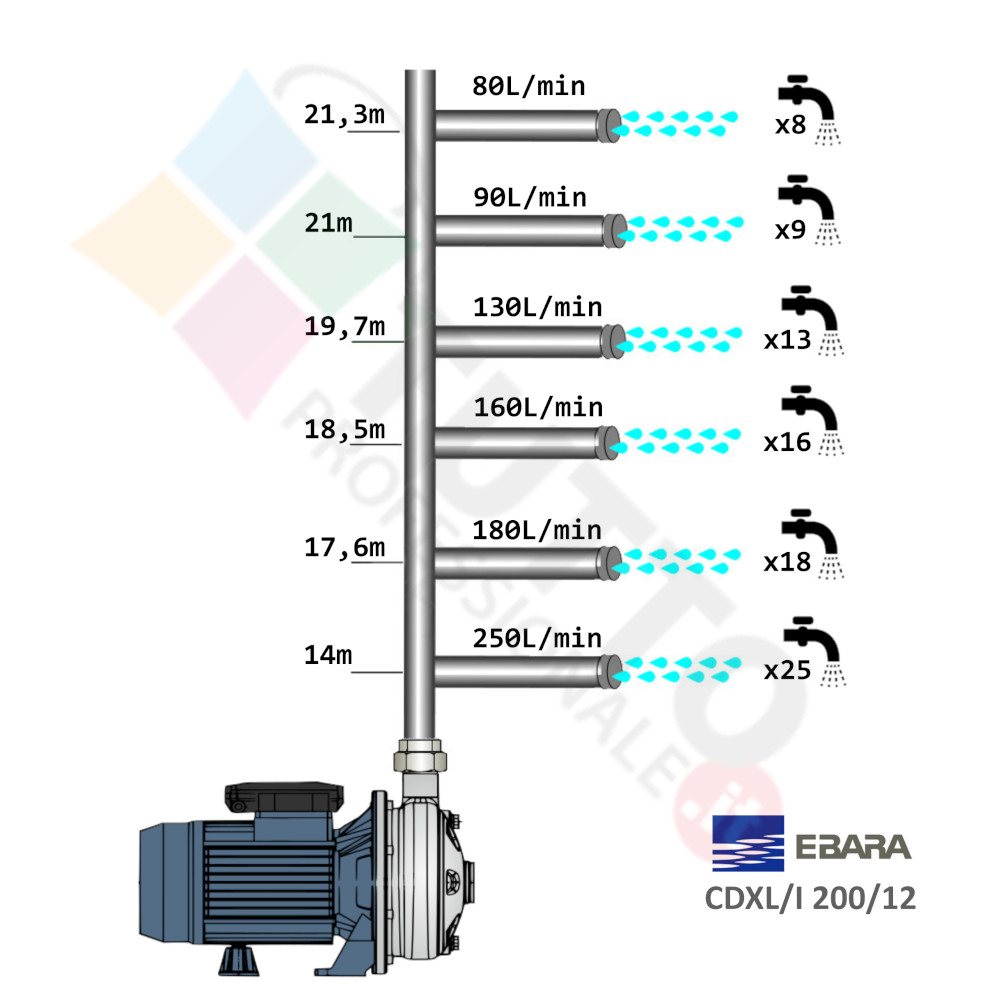 Questa elettropompa serve ad ottenere una pressione ottimale dell’acqua nel vostro impianto. La pompa CDX/I 200/12 IE3 realizzata da Ebara è di tipo superficie appartenente alla famiglia delle pompe centrifughe monogiranti con motore pompa IE3, la casse di rendimento ad alta efficienza. Questa pompa centrifuga viene utilizzata in molteplici applicazioni per il pompaggio di acque pulite. Il suo utilizzo può essere di tipo domestico, industriale e agricolo. Una pompa centrifuga è composta da una parte mobile detta girante, essa girando aspira l’acqua dal tubo di aspirazione e trasferisce all’acqua stessa l’energia generata dal suo movimento. Nel corpo pompa, dove si muove l’acqua spinta dalla forza generata dalla girante, avviene l’aumento della pressione dell’acqua e viene espulsa con pressione elevata dalla bocca di uscita. Questa elettropompa centrifuga risulta molto utile per aumentare quindi la pressione della vostra casa o altra abitazione, ma è anche indicata per uso industriale e quindi ideale ad un forte e continuo utilizzo, ed infinte risulta indicata anche per il giardinaggio e quindi per irrigazione di orti, giardini, serre, prati ed altre applicazioni simili.