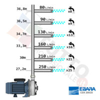 Questa elettropompa serve ad ottenere una pressione ottimale dell’acqua nel vostro impianto. La pompa CDXL/I 200/25 IE3 realizzata da Ebara è di tipo superficie appartenente alla famiglia delle pompe centrifughe monogiranti con motore pompa IE3, la casse di rendimento ad alta efficienza. Questa pompa centrifuga viene utilizzata in molteplici applicazioni per il pompaggio di acque pulite. Il suo utilizzo può essere di tipo domestico, industriale e agricolo. Una pompa centrifuga è composta da una parte mobile detta girante, essa girando aspira l’acqua dal tubo di aspirazione e trasferisce all’acqua stessa l’energia generata dal suo movimento. Nel corpo pompa, dove si muove l’acqua spinta dalla forza generata dalla girante, avviene l’aumento della pressione dell’acqua e viene espulsa con pressione elevata dalla bocca di uscita. Questa elettropompa centrifuga risulta molto utile per aumentare quindi la pressione della vostra casa o altra abitazione, ma è anche indicata per uso industriale e quindi ideale ad un forte e continuo utilizzo, ed infinte risulta indicata anche per il giardinaggio e quindi per irrigazione di orti, giardini, serre, prati ed altre applicazioni simili.