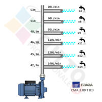 Questa elettropompa serve a spingere l’acqua nell’impianto idrico. La pompa CMA 3.00 è realizzata dalla rinomata azienda Ebara, è una elettropompa di superficie appartenente alla famiglia delle pompe centrifughe. Il modello monta un motore ad alto efficienza IE3 e viene utilizzata in molteplici applicazioni per il pompaggio di acque pulite. Il suo utilizzo può essere di tipo domestico, civile e agricolo. Una pompa centrifuga è composta da una parte mobile detta girante, essa girando aspira l’acqua dal tubo di aspirazione e trasferisce all’acqua stessa l’energia generata dal suo movimento. Nel corpo pompa, dove si muove l’acqua spinta dalla forza generata dalla girante, avviene l’aumento della pressione dell’acqua e viene espulsa con pressione elevata dalla bocca di uscita. Questa elettropompa centrifuga risulta molto utile per aumentare quindi la pressione della vostra casa o altra abitazione ed infinte risulta indicata anche per il giardinaggio e quindi per irrigazione di orti, giardini, serre, prati ed altre applicazioni simili. La pompa è ideale quindi per aumentare la pressione in modo ottimale e costante, accoppiandola ad esempio ad alcuni presscontrol, piccoli serbatoi autoclavi o altri sistemi per il controllo della pressione da erogare. Parlando della pompa centrifuga in questione evidenziamo subito che va alimentata con una tensione trifase, ha una potenza in cavalli di 3,00 hp e la temperatura del liquido da pompare massima è di +40 °C. Il corpo pompa è realizzato in ghisa ed internamente possiede una girante in Ottone e albero motore AISI 303 quindi tutti materiali particolarmente indicati per il corretto ed affidabile utilizzato dell’elettropompa, garantendo ottima resa e lunga durata nel tempo. L’installazione va effettuata in luoghi chiusi ben arieggiati o comunque protetti dalle intemperie in quanto la sua protezione certificata è di tipo IP44.Per ulteriori informazioni tecniche consultare la scheda tecnica della pompa.
