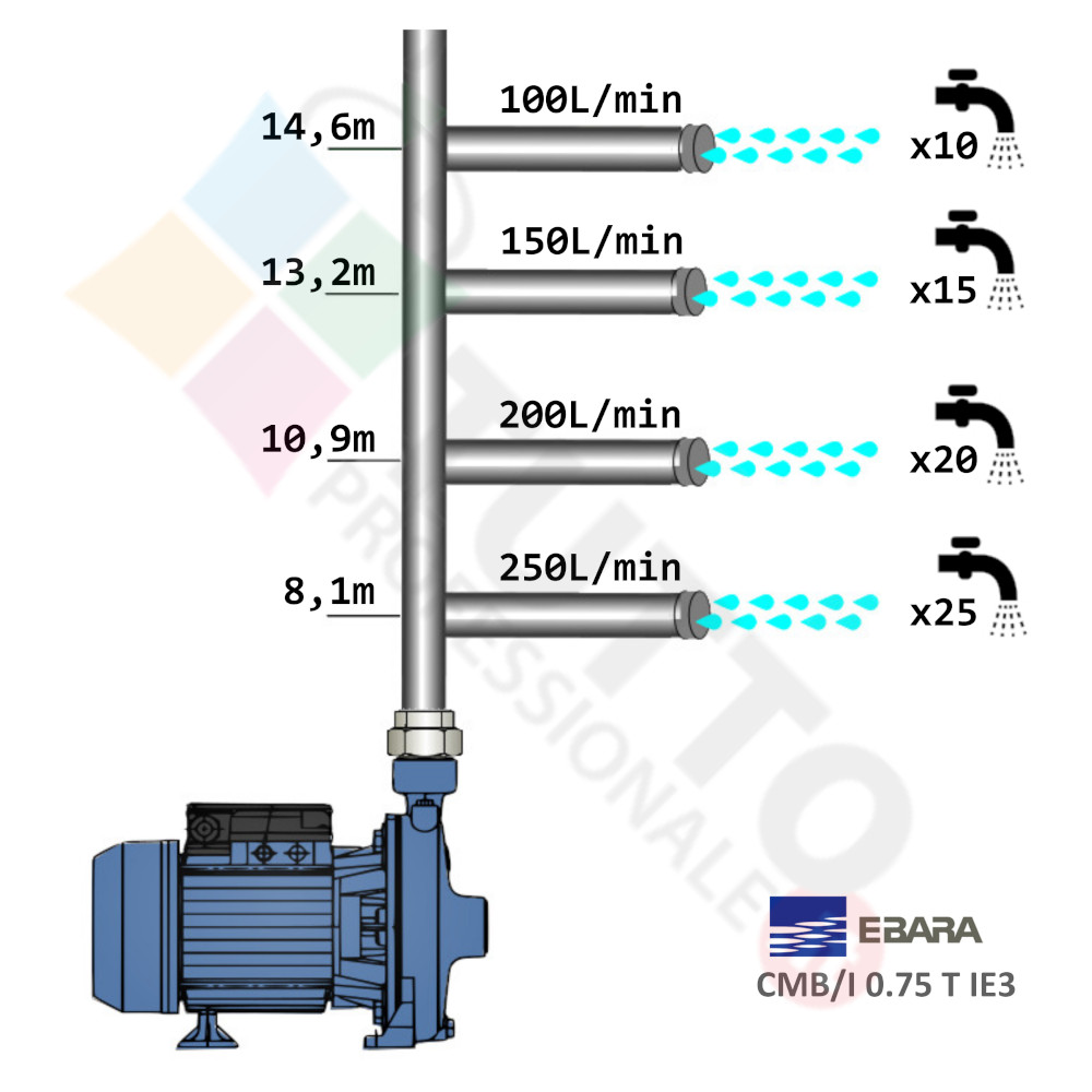 Questa elettropompa serve a spingere l’acqua nell’impianto idrico. La pompa CMB 075 è realizzata dalla rinomata azienda Ebara, è una elettropompa di superficie appartenente alla famiglia delle pompe centrifughe. Il modello viene utilizzata in molteplici applicazioni per il pompaggio di acque pulite. Il suo utilizzo può essere di tipo domestico, civile e agricolo. Una pompa centrifuga è composta da una parte mobile detta girante, essa girando aspira l’acqua dal tubo di aspirazione e trasferisce all’acqua stessa l’energia generata dal suo movimento. Nel corpo pompa, dove si muove l’acqua spinta dalla forza generata dalla girante, avviene l’aumento della pressione dell’acqua e viene espulsa con pressione elevata dalla bocca di uscita. Questa elettropompa centrifuga risulta molto utile per aumentare quindi la pressione della vostra casa o altra abitazione ed infinte risulta indicata anche per il giardinaggio e quindi per irrigazione di orti, giardini, serre, prati ed altre applicazioni simili. La pompa è ideale quindi per aumentare la pressione in modo ottimale e costante, accoppiandola ad esempio ad alcuni presscontrol, piccoli serbatoi autoclavi o altri sistemi per il controllo della pressione da erogare. Parlando della pompa centrifuga in questione evidenziamo subito che va alimentata con una tensione trifase, ha una potenza in cavalli di 0,75hp e la temperatura del liquido da pompare massima è di +40 °C. Il corpo pompa è realizzato in ghisa ed internamente possiede una girante in Ghisa e albero motore AISI 303, quindi tutti materiali particolarmente indicati per il corretto ed affidabile utilizzato dell’elettropompa, garantendo ottima resa e lunga durata nel tempo. L’installazione va effettuata in luoghi chiusi ben arieggiati o comunque protetti dalle intemperie in quanto la sua protezione certificata è di tipo IP44.Per ulteriori informazioni tecniche consultare la scheda tecnica della pompa.