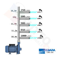Questa elettropompa serve a spingere l’acqua nell’impianto idrico. La pompa CMD/I 3.00 T IE3 è realizzata dalla rinomata azienda Ebara, è una elettropompa di superficie appartenente alla famiglia delle pompe centrifughe. Il modello monta un motore ad alto efficienza IE3. Viene utilizzata in molteplici applicazioni per il pompaggio di acque pulite. Il suo utilizzo può essere di tipo domestico, civile e agricolo. Una pompa centrifuga è composta da una parte mobile detta girante, essa girando aspira l’acqua dal tubo di aspirazione e trasferisce all’acqua stessa l’energia generata dal suo movimento. Nel corpo pompa, dove si muove l’acqua spinta dalla forza generata dalla girante, avviene l’aumento della pressione dell’acqua e viene espulsa con pressione elevata dalla bocca di uscita. Questa elettropompa centrifuga risulta molto utile per aumentare quindi la pressione della vostra casa o altra abitazione ed in fine risulta indicata anche per il giardinaggio e quindi per irrigazione di orti, giardini, serre, prati ed altre applicazioni simili. La pompa è ideale quindi per aumentare la pressione in modo ottimale e costante, accoppiandola ad esempio ad alcuni presscontrol, piccoli serbatoi autoclavi o altri sistemi per il controllo della pressione da erogare. Parlando della pompa centrifuga in questione evidenziamo subito che va alimentata con una tensione trifase, ha una potenza in cavalli di 3.00 hp e la temperatura del liquido da pompare massima è di +40 °C. Il corpo pompa è realizzato in ghisa ed internamente possiede una girante in ghisa e albero motore AISI 304 quindi tutti materiali particolarmente indicati per il corretto ed affidabile utilizzato dell’elettropompa, garantendo ottima resa e lunga durata nel tempo. L’installazione va effettuata in luoghi chiusi ben arieggiati o comunque protetti dalle intemperie in quanto la sua protezione certificata è di tipo IP44.Per ulteriori informazioni tecniche consultare la scheda tecnica della pompa.
