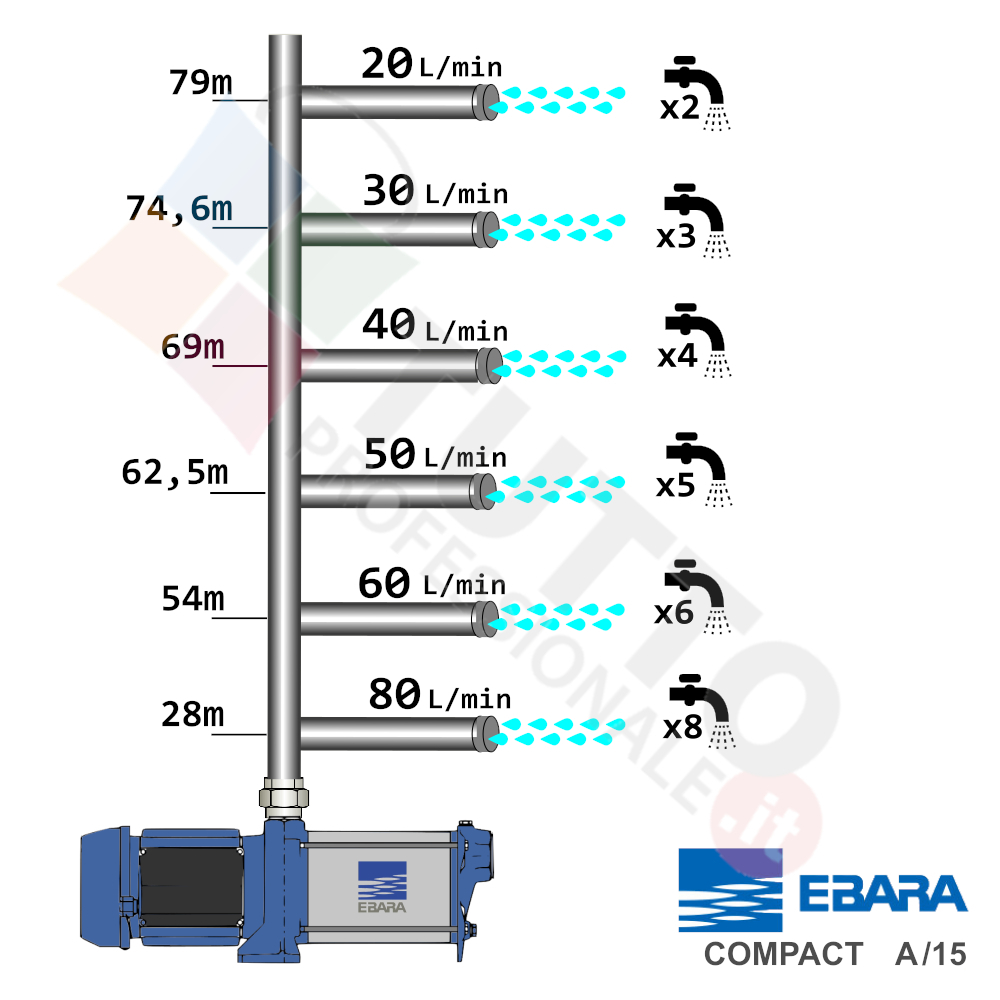 Questa elettropompa serve a spingere l’acqua nell’impianto idrico. La pompa COMPACT L A15, realizzata dalla rinomata azienda Ebara, è un’elettropompa di superficie appartenente alla famiglia delle pompe centrifughe multigiranti silenziose. La pompa in questione grazie alla sua estrema affidabilità e silenziosità trova un vasto impiego per uso domestico, utile quindi per aumentare la pressione dell’acqua della vostra casa o altra abitazione e risulta indicata anche per il giardinaggio e quindi per irrigazione di orti, giardini, serre, prati ed altre applicazioni simili. La pompa è ideale quindi per aumentare la pressione in modo ottimale e costante, accoppiandola ad esempio ad alcuni presscontrol, piccoli serbatoi autoclavi o altri sistemi per il controllo della pressione da erogare. Essendo una pompa multigirante il rumore generato è molto basso, al suo interno troviamo più parti mobili dette appunto giranti, esse girando aspirando l’acqua dal tubo di aspirazione e trasferiscono all’acqua stessa l’energia generata dal loro movimento. Nel corpo pompa, dove si muove l’acqua spinta dalla forza generata dalle giranti, avviene l’aumento della pressione dell’acqua e viene espulsa con pressione elevata dalla bocca di uscita. Parlando della pompa centrifuga in questione evidenziamo subito che va alimentata con una tensione trifase, ha una potenza in cavalli di 1,5 hp e la temperatura del liquido da pompare massima è di 40°C.Il corpo pompa è realizzato in ghisa ed internamente possiede girante in PPE+PS rinforzato con fibre di vetro, albero motore in AISI 416, quindi tutti materiali particolarmente indicati per il corretto ed affidabile utilizzato dell’elettropompa, garantendo ottimo funzionamento e lunga durata nel tempo. L’installazione va effettuata in luoghi chiusi ben arieggiati o comunque protetti dalle intemperie in quanto la sua protezione certificata è di tipo IP44.Per ulteriori informazioni tecniche consultare la scheda tecnica della pompa.