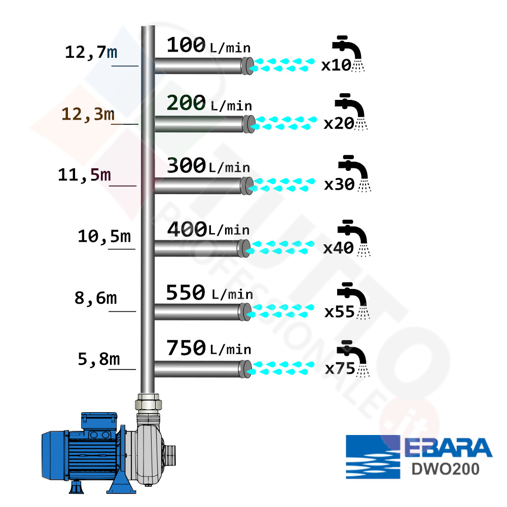 La pompa viene utilizzata per spingere l’acqua all’interno dell’impianto idrico. Il modello DWO di casa Ebara è realizzato per l’utilizzo in ambienti domestici o industriali, quindi ideale oltre che al classico utilizzo domestico anche per essere sottoposto ad utilizzi continui e stressanti. Il suo utilizzo è indicato per pompare acqua pulita ma anche non completamente pulita, in quanto monta una girante a flusso radiale aperta. Questa girante realizzata in acciaio INOX 304 la rende adatta a pompare liquidi con parti solide fino a 19mm di diametro. Questa è caratterizzata dalla capacità di spostare il flusso radialmente, cioè in direzione perpendicolare all’albero della pompa. L’acqua una volta entrata in circolo grazie al movimento della girante aumenterà di pressione e verrà espulsa tramite la bocca d’uscita.
