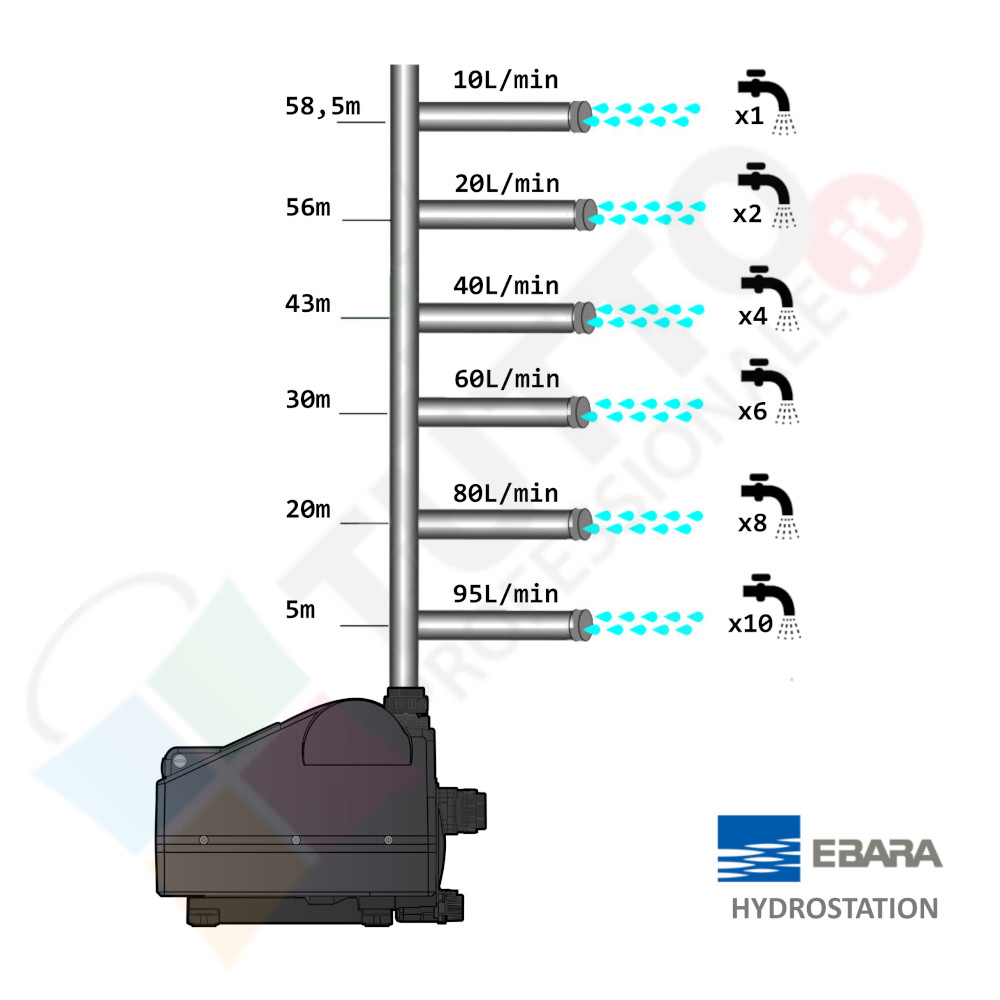 La pompa Ebara Hydrostation serve a spingere l’acqua nell’impianto idrico. Questa innovativa soluzione di casa Ebara è in grado di gestire in modo eccellente la richiesta di acqua in abitazioni, impianti residenziali, edifici commerciali e tanto altro. A differenza di un classico modello autoclave si avrà un prodotto compatto e che gode dell’innovativa tecnologia inverter. L’inverter permette al motore di variare il numero di giri in base alla richiesta idrica, garantendo una maggiore efficienza e quindi un notevole risparmio di energia.