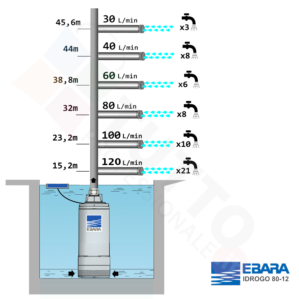 L’azienda Ebara ha ideato e realizzato la pompa sommersa per uso domestico d’eccellenza. La pompa sommersa Idrogo risulta essere una delle più apprezzate per pescare l’acqua e garantire una pressione ottimale per i più svariati utilizzi. Il sistema multigirante permette di pompare l’acqua in maniera ottimale ed avere nell’impianto una pressione ideale ad un’alta prevalenza. Queste pompe sommerse elettriche grazie al loro elevato rendimento e alla loro affidabilità trovano un vasto impiego, perfette per uso domestico, ad esempio immerse in serbatoi, pozzi, pozzetti o impieghi simili. È ottima per l’utilizzo agricolo per irrigazione di orti, serre, giardini e altri impieghi simili. Nulla toglie che può essere usata anche per uso industriale, quindi adatta anche all’utilizzo continuo. Andrà poi associata ad un presscontrol o sistema autoclave per controllare la pressione erogata in base alle vostre esigenze.