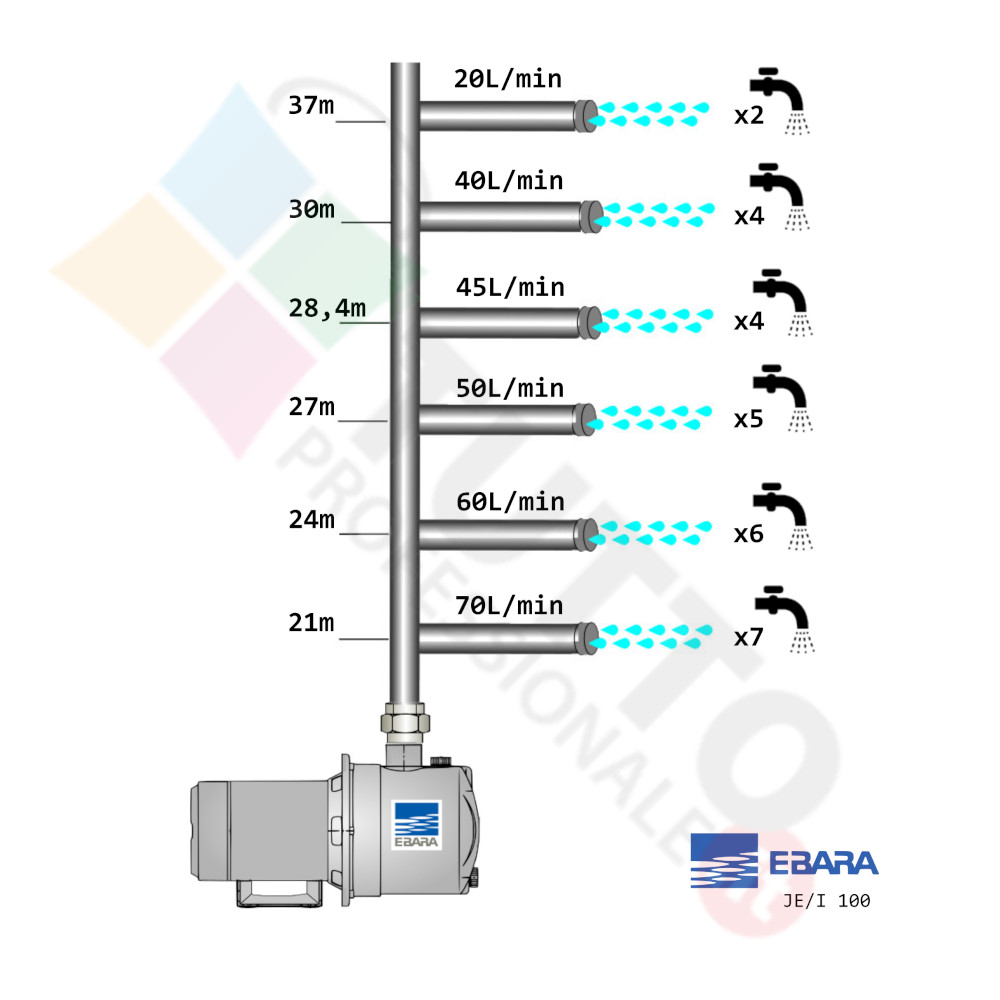 La pompa farà circolare ad un ottima pressione l’acqua nel vostro impianto idrico. Dite addio ai cali di pressione mentre usate l’acqua della vostra abitazione. La pompa JE è realizzata da Ebara, una delle migliori aziende di produzione dell’elettropompe. La pompa è una centrifuga autoadescante, ed ha la particolarità di aspirare l’aria contenuta nel tubo di aspirazione. Questo accade grazie al movimento rotatorio della giranti associato ad un kit chiamato Venturi (realizzato esclusivamente da Ebara). Questi 2 componenti creano una forte turbolenza nel liquido contenuto all’interno del corpo pompa, e genera a sua volta una depressione risucchiando l’aria in essa contenuta.