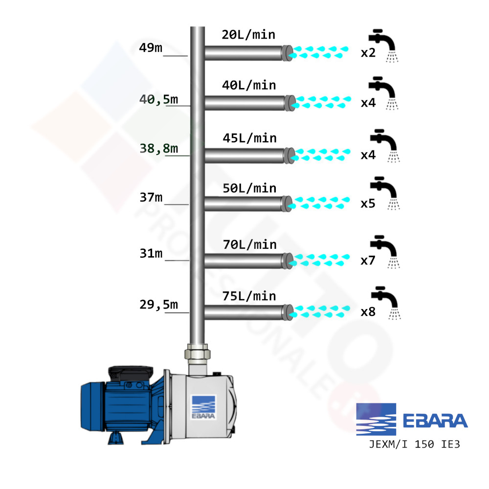 La pompa farà circolare ad un ottima pressione l’acqua nel vostro impianto idrico. La pompa JEXM/E 150 è realizzata da Ebara, una delle migliori aziende di produzione dell’elettropompe. L’elettropompa è utilizzata in ambito domestico, in particolare per aumentare notevolmente la pressione dell’acqua pulita. Quindi associata a ad un corretto dispositivo di controllo pressione, come un presscontrol, diventa una soluzione autoclave perfetta per la tua casa, ufficio o locali simili. Nulla toglie che può essere utilizzata per il giardinaggio in quanto risulta ottima anche per questo impiego.