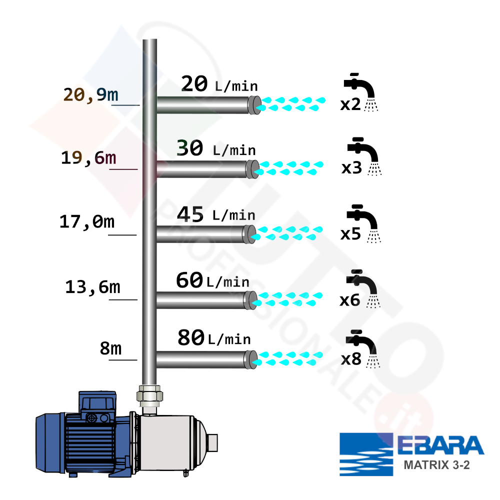 Questa elettropompa serve a spingere l’acqua nell’impianto idrico. La pompa è realizzata da Ebara, una delle aziende leader nella produzione di elettropompe. Il modello MATRIX 3-2T/0,45 IE3 è un’elettropompa di superficie appartenente alla famiglia delle pompe centrifughe multistadio. La pompa in questione grazie alla sua estrema affidabilità trova ottimo impiego per uso domestico, utile quindi per aumentare la pressione dell’acqua della vostra casa o altra abitazione e risulta indicata anche per il giardinaggio e quindi per irrigazione di orti, giardini, serre, prati ed altre applicazioni simili. Ottima per utilizzi industriali e quindi sottoposte a continuo utilizzo. La pompa è ideale quindi per aumentare la pressione in modo ottimale e costante, accoppiandola ad esempio ad alcuni presscontrol, piccoli serbatoi autoclavi o altri sistemi per il controllo della pressione da erogare. Essendo una pompa multigirante il rumore generato è molto basso, al suo interno troviamo più parti mobili dette giranti. Queste girando aspirando l’acqua dal tubo di aspirazione e trasferiscono all’acqua stessa l’energia generata dal loro movimento. Nel corpo pompa, dove si muove l’acqua spinta dalla forza generata dalle giranti, avviene l’aumento della pressione dell’acqua e viene espulsa con pressione elevata dalla bocca di uscita. Parlando della pompa centrifuga in questione precisiamo che va alimentata con una tensione monofase, ha una potenza in cavalli di 0,60 hp e la temperatura del liquido da pompare da parte da -15°C a +85°C. Il corpo pompa è realizzato in ghisa ed internamente possiede girante e albero motore in acciaio inox, quindi tutti materiali particolarmente indicati per il corretto ed affidabile utilizzato dell’elettropompa, garantendo ottimo funzionamento e lunga durata nel tempo. L’installazione va effettuata in luoghi chiusi ben arieggiati o comunque protetti dalle intemperie in quanto la sua protezione certificata è di tipo IP55. Per ulteriori informazioni tecniche consultare la scheda tecnica della pompa.