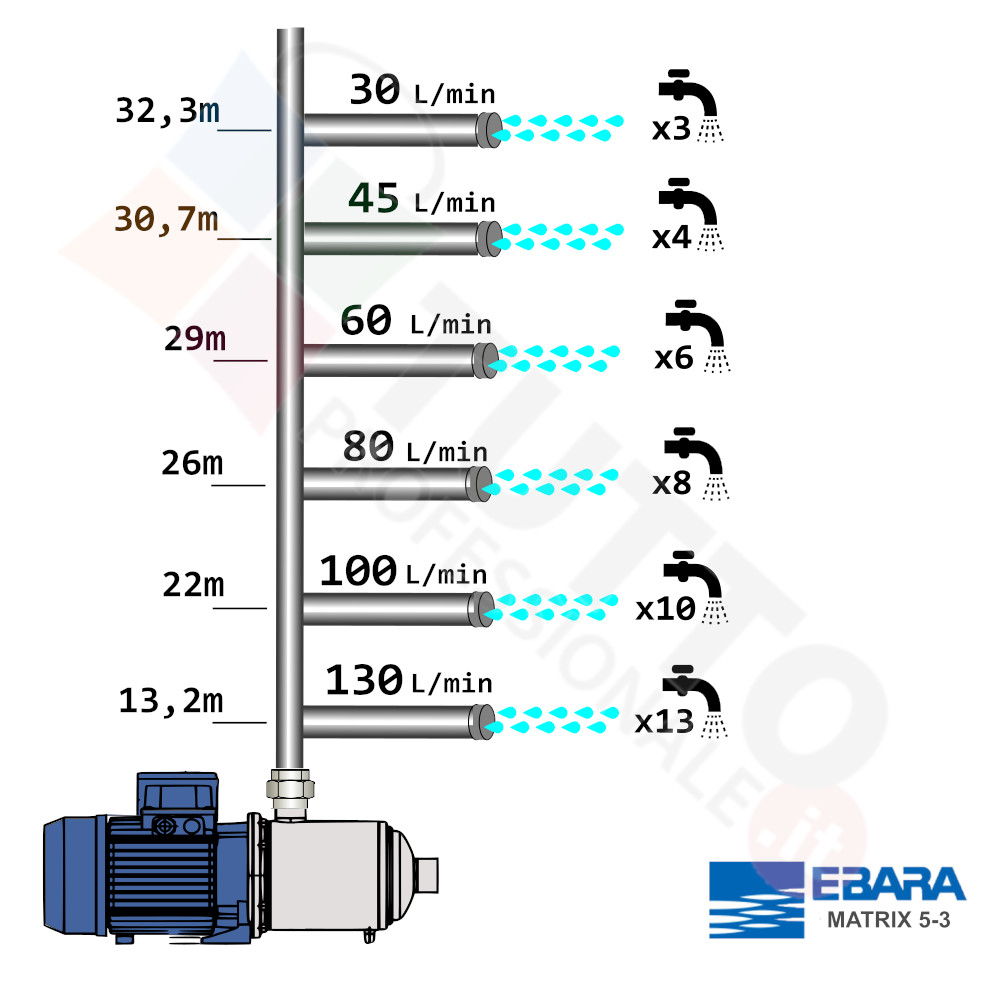 Questa elettropompa serve a spingere l’acqua nell’impianto idrico. La pompa è realizzata da Ebara, una delle aziende leader nella produzione di elettropompe. Il modello MATRIX 5-3T/0,65M è un’elettropompa di superficie appartenente alla famiglia delle pompe centrifughe multistadio. L’autoclave in questione grazie alla sua estrema affidabilità trova ottimo impiego per uso domestico, utile quindi per aumentare la pressione dell’acqua della vostra casa o altra abitazione. Risulta indicata anche per il giardinaggio e quindi per irrigazione di orti, giardini, serre, prati ed altre applicazioni simili. Ottima per utilizzi industriali e quindi sottoposte a continuo utilizzo.