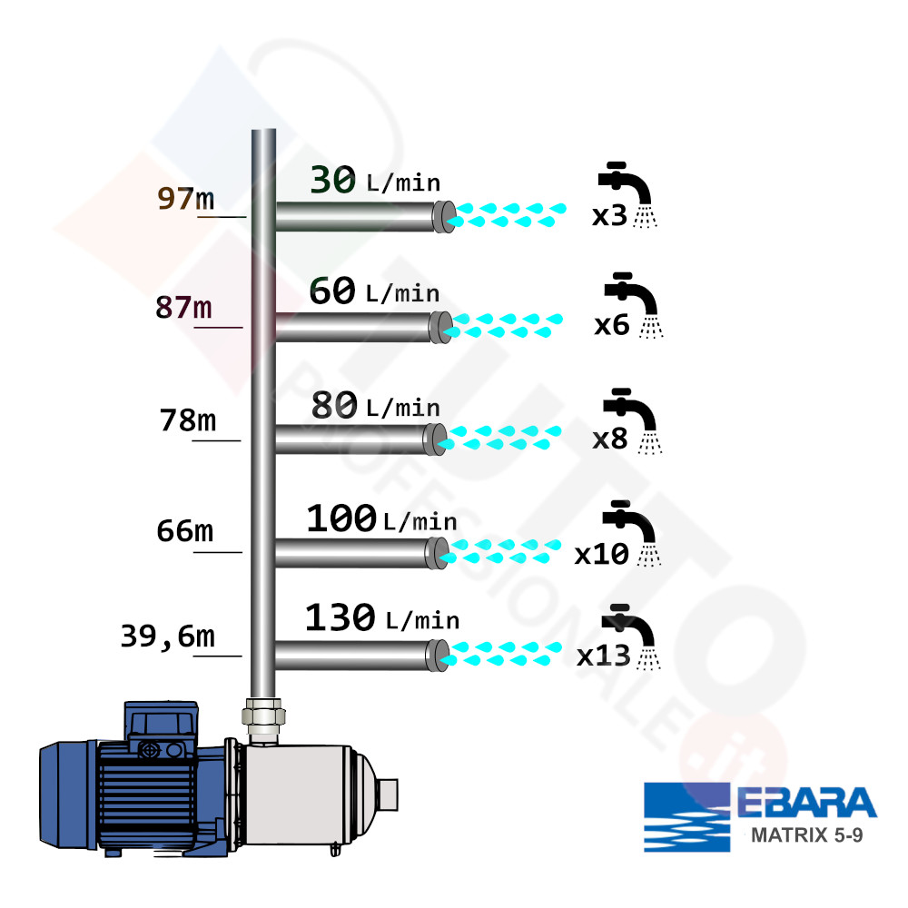Questa elettropompa serve a spingere l’acqua nell’impianto idrico. La pompa è realizzata da Ebara, una delle aziende leader nella produzione di elettropompe. Il modello MATRIX 5-9T/2,2M è un’elettropompa di superficie appartenente alla famiglia delle pompe centrifughe multistadio. L’autoclave in questione grazie alla sua estrema affidabilità trova ottimo impiego per uso domestico, utile quindi per aumentare la pressione dell’acqua della vostra casa o altra abitazione. Risulta indicata anche per il giardinaggio e quindi per irrigazione di orti, giardini, serre, prati ed altre applicazioni simili. Ottima per utilizzi industriali e quindi sottoposte a continuo utilizzo.
