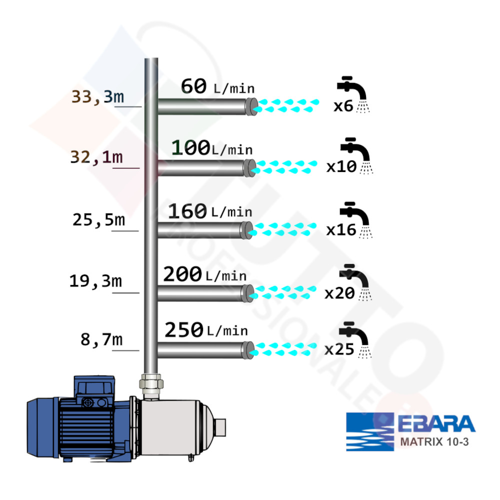 Questa elettropompa serve a spingere l’acqua nell’impianto idrico. La pompa è realizzata da Ebara, una delle aziende leader nella produzione di elettropompe. Il modello MATRIX/A10-3T/1,3M è un’elettropompa di superficie appartenente alla famiglia delle pompe centrifughe multistadio. L’autoclave in questione grazie alla sua estrema affidabilità trova ottimo impiego per uso domestico, utile quindi per aumentare la pressione dell’acqua della vostra casa o altra abitazione. Risulta indicata anche per il giardinaggio e quindi per irrigazione di orti, giardini, serre, prati ed altre applicazioni simili. Ottima per utilizzi industriali e quindi sottoposte a continuo utilizzo.