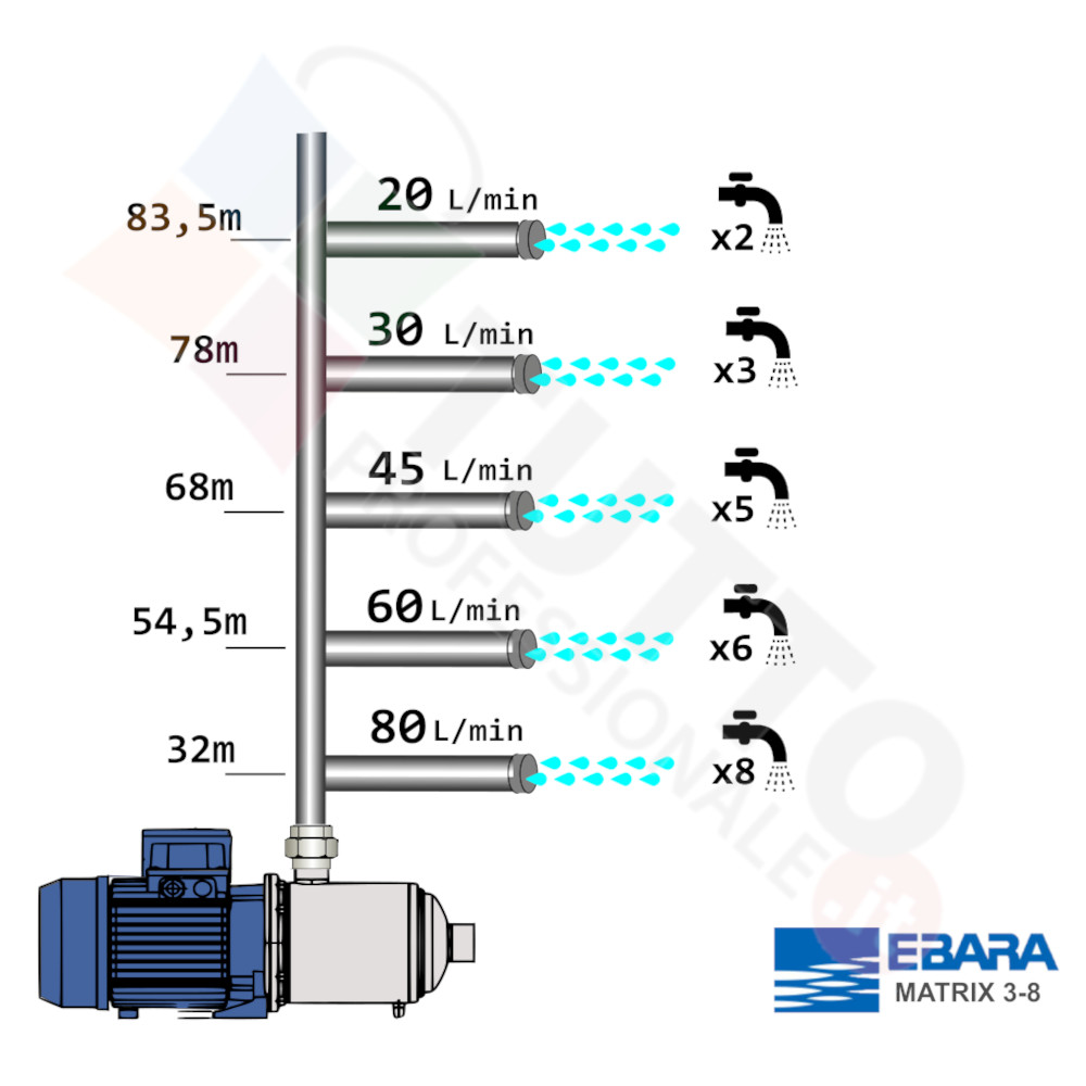 Questa elettropompa serve a spingere l’acqua nell’impianto idrico. La pompa è realizzata da Ebara, una delle aziende leader nella produzione di elettropompe. Il modello MATRIX/I 3-8T/1,3 IE3 è un’elettropompa di superficie appartenente alla famiglia delle pompe centrifughe multistadio. L’autoclave in questione grazie alla sua estrema affidabilità trova ottimo impiego per uso domestico, utile quindi per aumentare la pressione dell’acqua della vostra casa o altra abitazione. Risulta indicata anche per il giardinaggio e quindi per irrigazione di orti, giardini, serre, prati ed altre applicazioni simili. Ottima per utilizzi industriali e quindi sottoposte a continuo utilizzo.