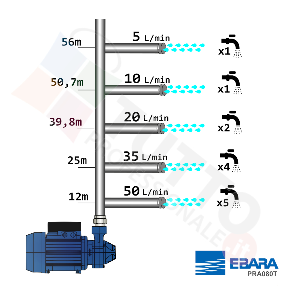 Questa elettropompa serve a spingere l’acqua nell’impianto idrico. La pompa PRA 080, realizzata dalla rinomata azienda Ebara, è una elettropompa di superficie appartenente alla famiglia delle pompe periferiche. Viene utilizzata per il pompaggio di acque pulite all’interno di impianti domestici o piccoli impianti di irrigazione. Il funzionamento della pompa periferica è molto semplice ed affidabile, in quanto per mezzo del movimento delle giranti nel corpo pompante si aumenta la pressione dell’acqua pompata che andrà a soddisfare le vostre esigenze di utilizzo.
