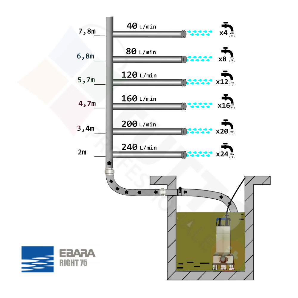 La pompa è utilizzata per essere immersa in acque sporche ed aspirare l’acqua grazie al sistema di aspirazione vortex. Ebara presenta il modello RIGHT/A 075 come un’elettropompa per fognatura completa. Si presenta con materiali di alta qualità, prevalentemente in acciaio inox. Il suo utilizzo può essere versatile, in quanto viene utilizzata in ambiente domestico, civile e anche industriale. La dimensione dei solidi che può aspirare è gestita dall’altezza dei piedi posti alla base, dove un solido con dimensioni maggiori non passerà nell’elettropompa evitando in questo modo il danneggiamento o il blocco in lavoro della pompa Ebara. L’alimentazione della pompa è di tipo monofase, possiede un cavo di 5m che permette l’immersione fino a 2 metri dell’elettropompa. La sua potenza in cavalli è di 0,75hp per un assorbimento di 0,55kw. I materiali della pompa sommersa per fognatura sono tutti di alta qualità, maggiormente in acciaio inox e quindi garantiti per un’ottima resistenza. Per ulteriori informazioni consultare la scheda tecnica del prodotto.