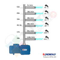Le prestazioni del modello Future JETm 2CX promettono una potenza in cavalli da 1,00hp, una potenza assorbita di 0,75kw ed una tensione di alimentazione monofase a 230V. Garantisce una portata massima di 120l/min ad un’altezza di 10 metri, una portata minima 5l/min ad un’altezza di 52 metri, e la massima temperatura del liquido di pompaggio supportata è di 40°C.