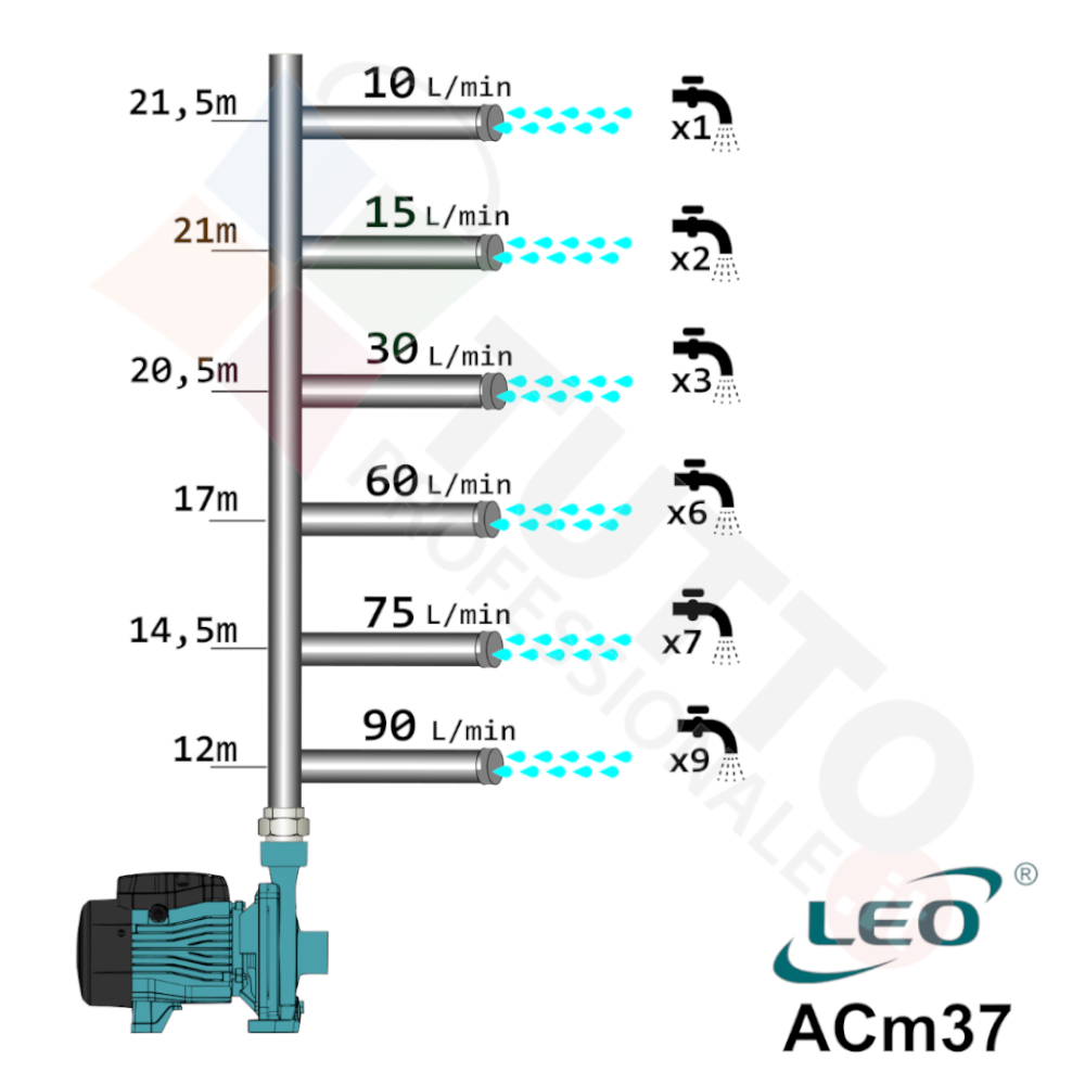 Questa elettropompa serve a spingere l’acqua nell’impianto idrico. La pompa ACm37, realizzata dalla rinomata azienda LeoPump, è una elettropompa di superficie appartenente alla famiglia delle pompe centrifughe. Questa pompa centrifuga viene utilizzata in molteplici applicazioni per il pompaggio di acque pulite. Il suo utilizzo può essere di tipo domestico, civile e agricolo. Una pompa centrifuga è composta da una parte mobile detta girante, essa girando aspira l’acqua dal tubo di aspirazione e trasferisce all’acqua stessa l’energia generata dal suo movimento. Nel corpo pompa, dove si muove l’acqua spinta dalla forza generata dalla girante, avviene l’aumento della pressione dell’acqua e viene espulsa con pressione elevata dalla bocca di uscita. Questa elettropompa centrifuga risulta molto utile per aumentare quindi la pressione della vostra casa o altra abitazione ed infinte risulta indicata anche per il giardinaggio e quindi per irrigazione di orti, giardini, serre, prati ed altre applicazioni simili. La pompa è ideale quindi per aumentare la pressione in modo ottimale e costante, accoppiandola ad esempio ad alcuni presscontrol, piccoli serbatoi autoclavi o altri sistemi per il controllo della pressione da erogare. Parlando della pompa centrifuga in questione evidenziamo subito che va alimentata con una tensione monofase, ha una potenza in cavalli di 0,60 hp e la temperatura del liquido da pompare va da da -10 °C fino a +90 °C. Il corpo pompa è realizzato in ghisa ed internamente possiede una girante e un albero motore in acciaio inox, quindi tutti materiali particolarmente indicati per il corretto ed affidabile utilizzato dell’elettropompa, garantendo ottima resa e lunga durata nel tempo. L’installazione va effettuata in luoghi chiusi ben arieggiati o comunque protetti dalle intemperie in quanto la sua protezione certificata è di tipo IPX5.Per ulteriori informazioni tecniche consultare la scheda tecnica della pompa.