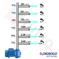 Questa elettropompa serve a spingere l’acqua nell’impianto idrico. La pompa 2CP25/16A è realizzata dalla rinomata azienda italiana Pedrollo, è un’elettropompa centrifuga bigirante di superficie utilizzata per pompare acqua pulita. Garantisce elevati rendimenti e adattabilità alle più svariate applicazioni. Viene utilizzata nel settore domestico, civile, industriale e in particolare per la distribuzione dell’acqua in accoppiamento con sistemi come serbatoi, autoclave, presscontrol o altri sistemi per il controllo della pressione da erogare.Il suo funzionamento avviene grazie ad una doppia girante interna che girando vanno ad aspirare l’acqua dal tubo di aspirazione e trasferiscono all’acqua stessa l’energia generata dal loro movimento. Nel corpo pompa, dove si muove l’acqua spinta dalla forza generata dalle giranti, avviene l’aumento della pressione dell’acqua e viene espulsa con pressione elevata dalla bocca di uscita.Questa pompa bigirante centrifuga funziona grazie alla tensione trifase, ha una potenza in cavalli di 3 hp e la temperatura del liquido da pompare va da da -10 °C fino a +90 °C.Il corpo pompa è realizzato in ghisa ed internamente possiede girante in ottone e albero motore in acciaio inox, quindi tutti materiali particolarmente indicati per il corretto ed affidabile utilizzato dell’elettropompa, garantendo ottimo funzionamento e lunga durata nel tempo. L’installazione va effettuata in luoghi chiusi ben arieggiati o comunque protetti dalle intemperie in quanto la sua protezione certificata è di tipo IPX4.Per ulteriori informazioni tecniche consultare la scheda tecnica della pompa.