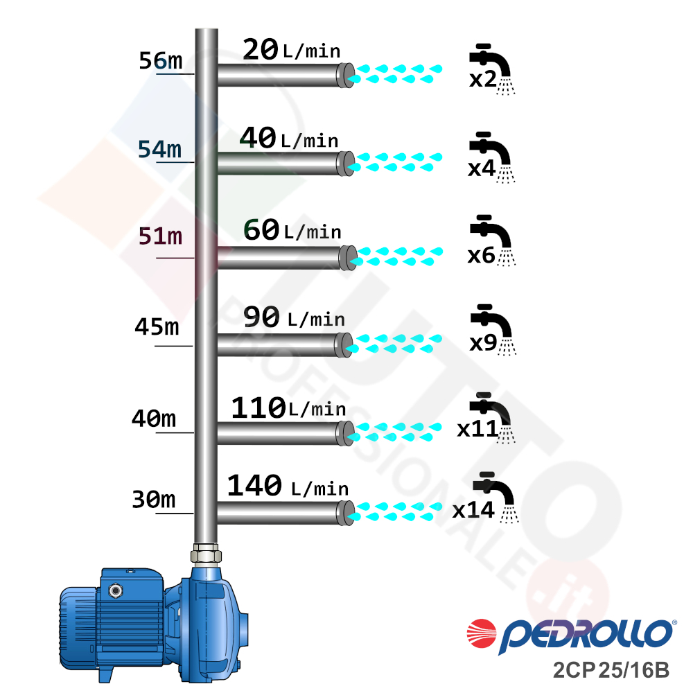 Questa elettropompa serve a spingere l’acqua nell’impianto idrico. La pompa 2CP 25/16B è realizzata dalla rinomata azienda italiana Pedrollo, è un’elettropompa centrifuga bigirante di superficie utilizzata per pompare acqua pulita. Garantisce elevati rendimenti e adattabilità alle più svariate applicazioni. Viene utilizzata nel settore domestico, civile, industriale e in particolare per la distribuzione dell’acqua in accoppiamento con sistemi come serbatoi, autoclave, presscontrol o altri sistemi per il controllo della pressione da erogare.Il suo funzionamento avviene grazie ad una doppia girante interna che girando vanno ad aspirare l’acqua dal tubo di aspirazione e trasferiscono all’acqua stessa l’energia generata dal loro movimento. Nel corpo pompa, dove si muove l’acqua spinta dalla forza generata dalle giranti, avviene l’aumento della pressione dell’acqua e viene espulsa con pressione elevata dalla bocca di uscita.Questa pompa bigirante centrifuga funziona grazie alla tensione trifase, ha una potenza in cavalli di 2 hp e la temperatura del liquido da pompare va da da -10 °C fino a +90 °C.Il corpo pompa è realizzato in ghisa ed internamente possiede girante in ottone e albero motore in acciaio inox, quindi tutti materiali particolarmente indicati per il corretto ed affidabile utilizzato dell’elettropompa, garantendo ottimo funzionamento e lunga durata nel tempo. L’installazione va effettuata in luoghi chiusi ben arieggiati o comunque protetti dalle intemperie in quanto la sua protezione certificata è di tipo IPX4.Per ulteriori informazioni tecniche consultare la scheda tecnica della pompa.