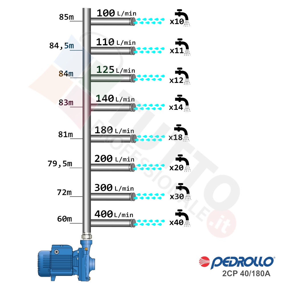 Questa elettropompa serve a spingere l’acqua nell’impianto idrico. La pompa 2CP40/180A è realizzata dalla rinomata azienda italiana Pedrollo, è un’elettropompa centrifuga bigirante di superficie utilizzata per pompare acqua pulita. Garantisce elevati rendimenti e adattabilità alle più svariate applicazioni. Viene utilizzata nel settore domestico, civile, industriale e in particolare per la distribuzione dell’acqua in accoppiamento con sistemi come serbatoi, autoclave, presscontrol o altri sistemi per il controllo della pressione da erogare.Il suo funzionamento avviene grazie ad una doppia girante interna che girando vanno ad aspirare l’acqua dal tubo di aspirazione e trasferiscono all’acqua stessa l’energia generata dal loro movimento. Nel corpo pompa, dove si muove l’acqua spinta dalla forza generata dalle giranti, avviene l’aumento della pressione dell’acqua e viene espulsa con pressione elevata dalla bocca di uscita.Questa pompa bigirante centrifuga funziona grazie alla tensione trifase, ha una potenza in cavalli di 10 hp e la temperatura del liquido da pompare va da da -10 °C fino a +90 °C.Il corpo pompa è realizzato in ghisa ed internamente possiede girante in ottone e albero motore in acciaio inox, quindi tutti materiali particolarmente indicati per il corretto ed affidabile utilizzato dell’elettropompa, garantendo ottimo funzionamento e lunga durata nel tempo. L’installazione va effettuata in luoghi chiusi ben arieggiati o comunque protetti dalle intemperie in quanto la sua protezione certificata è di tipo IPX4.Per ulteriori informazioni tecniche consultare la scheda tecnica della pompa.