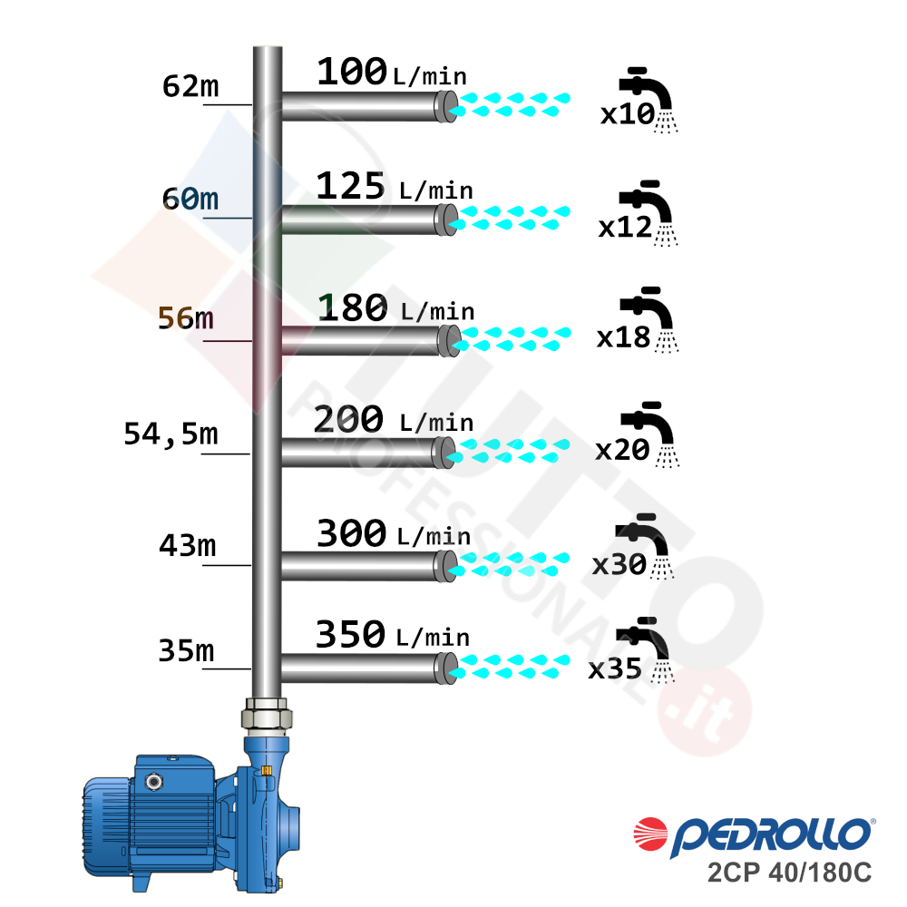 Questa elettropompa serve a spingere l’acqua nell’impianto idrico. La pompa 2CP40/180C è realizzata dalla rinomata azienda italiana Pedrollo, è un’elettropompa centrifuga bigirante di superficie utilizzata per pompare acqua pulita. Garantisce elevati rendimenti e adattabilità alle più svariate applicazioni. Viene utilizzata nel settore domestico, civile, industriale e in particolare per la distribuzione dell’acqua in accoppiamento con sistemi come serbatoi, autoclave, presscontrol o altri sistemi per il controllo della pressione da erogare.Il suo funzionamento avviene grazie ad una doppia girante interna che girando vanno ad aspirare l’acqua dal tubo di aspirazione e trasferiscono all’acqua stessa l’energia generata dal loro movimento. Nel corpo pompa, dove si muove l’acqua spinta dalla forza generata dalle giranti, avviene l’aumento della pressione dell’acqua e viene espulsa con pressione elevata dalla bocca di uscita.Questa pompa bigirante centrifuga funziona grazie alla tensione trifase, ha una potenza in cavalli di 5,5 hp e la temperatura del liquido da pompare va da da -10 °C fino a +90 °C.Il corpo pompa è realizzato in ghisa ed internamente possiede girante in ottone e albero motore in acciaio inox, quindi tutti materiali particolarmente indicati per il corretto ed affidabile utilizzato dell’elettropompa, garantendo ottimo funzionamento e lunga durata nel tempo. L’installazione va effettuata in luoghi chiusi ben arieggiati o comunque protetti dalle intemperie in quanto la sua protezione certificata è di tipo IPX4.Per ulteriori informazioni tecniche consultare la scheda tecnica della pompa.