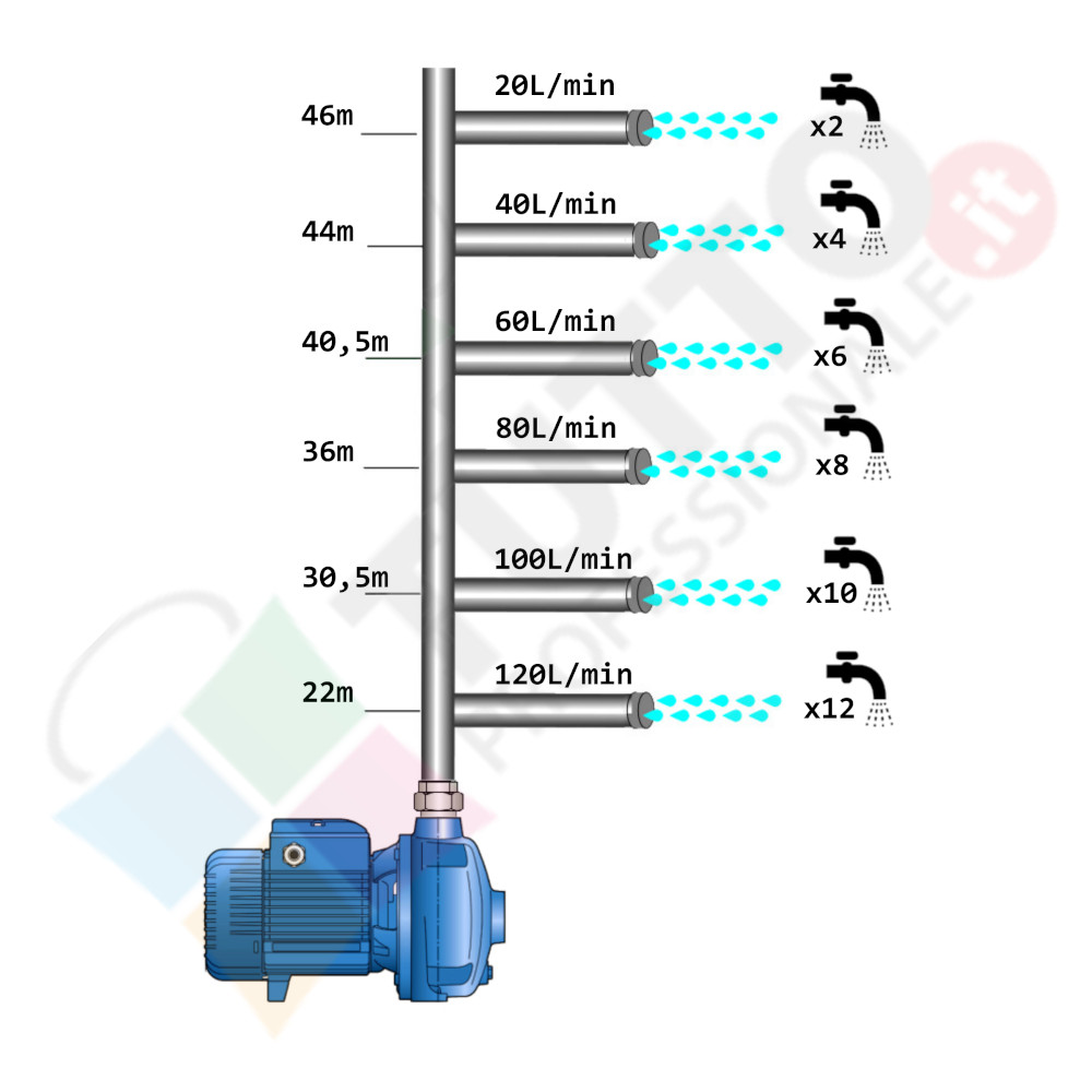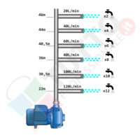 Il suo funzionamento avviene grazie ad una doppia girante interna che girando vanno ad aspirare l’acqua dal tubo di aspirazione e trasferiscono all’acqua stessa l’energia generata dal loro movimento. Nel corpo pompa, dove si muove l’acqua spinta dalla forza generata dalle giranti, avviene l’aumento della pressione dell’acqua e viene espulsa con pressione elevata dalla bocca di uscita.