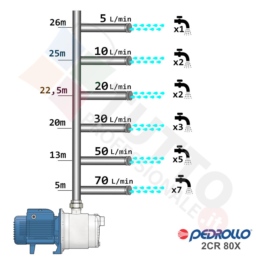 Questa elettropompa serve a spingere l’acqua nell’impianto idrico. La pompa è realizzata da Pedrollo, una delle aziende leader nella produzione di elettropompe. Il modello 2CR 80X è un’elettropompa di superficie appartenente alla famiglia delle pompe centrifughe multigiranti silenziose. La pompa in questione grazie alla sua estrema affidabilità e silenziosità trova ottimo impiego per uso domestico, utile quindi per aumentare la pressione dell’acqua della vostra casa o altra abitazione e risulta indicata anche per il giardinaggio e quindi per irrigazione di orti, giardini, serre, prati ed altre applicazioni simili. La pompa è ideale quindi per aumentare la pressione in modo ottimale e costante, accoppiandola ad esempio ad alcuni presscontrol, piccoli serbatoi autoclavi o altri sistemi per il controllo della pressione da erogare.Essendo una pompa multigirante il rumore generato è molto basso, al suo interno troviamo più parti mobili dette giranti. Queste girando aspirando l’acqua dal tubo di aspirazione e trasferiscono all’acqua stessa l’energia generata dal loro movimento. Nel corpo pompa, dove si muove l’acqua spinta dalla forza generata dalle giranti, avviene l’aumento della pressione dell’acqua e viene espulsa con pressione elevata dalla bocca di uscita.Parlando della pompa centrifuga in questione precisiamo che va alimentata con una tensione trifase, ha una potenza in cavalli di 0,5 hp e la temperatura del liquido da pompare arriva fino a 40°C.Il corpo pompa è realizzato in ghisa ed internamente possiede girante in Noryl e albero motore in acciaio inox, quindi tutti materiali particolarmente indicati per il corretto ed affidabile utilizzato dell’elettropompa, garantendo ottimo funzionamento e lunga durata nel tempo. L’installazione va effettuata in luoghi chiusi ben arieggiati o comunque protetti dalle intemperie in quanto la sua protezione certificata è di tipo IPX4.Per ulteriori informazioni tecniche consultare la scheda tecnica della pompa.