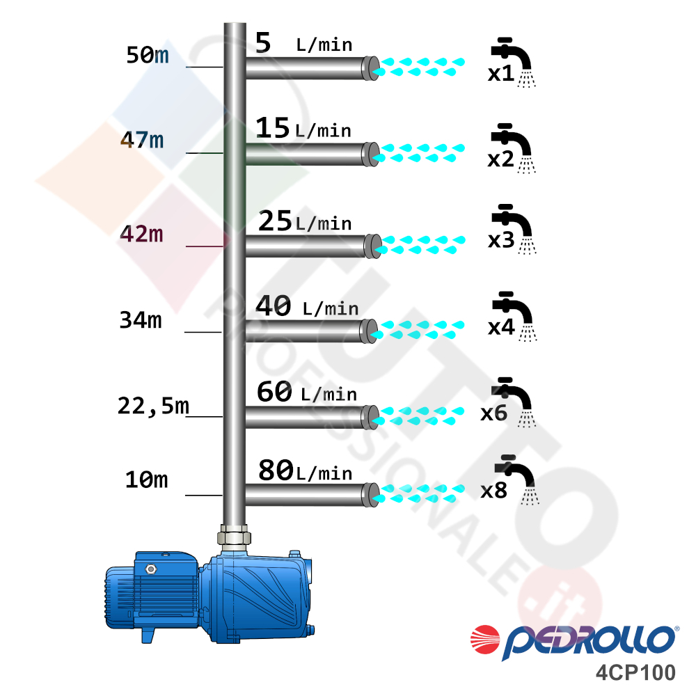 Questa elettropompa serve a spingere l’acqua nell’impianto idrico. La pompa 4CP 100, realizzata dalla rinomata azienda italiana Pedrollo, è un’elettropompa di superficie appartenente alla famiglia delle pompe centrifughe multigiranti silenziose. La pompa in questione grazie alla sua estrema affidabilità e silenziosità trova un vasto impiego per uso domestico, utile quindi per aumentare la pressione dell’acqua della vostra casa o altra abitazione e risulta indicata anche per il giardinaggio e quindi per irrigazione di orti, giardini, serre, prati ed altre applicazioni simili. La pompa è ideale quindi per aumentare la pressione in modo ottimale e costante, accoppiandola ad esempio ad alcuni presscontrol, piccoli serbatoi autoclavi o altri sistemi per il controllo della pressione da erogare.Essendo una pompa multigirante il rumore generato è molto basso, al suo interno troviamo più parti mobili dette appunto giranti, esse girando aspirando l’acqua dal tubo di aspirazione e trasferiscono all’acqua stessa l’energia generata dal loro movimento. Nel corpo pompa, dove si muove l’acqua spinta dalla forza generata dalle giranti, avviene l’aumento della pressione dell’acqua e viene espulsa con pressione elevata dalla bocca di uscita. Parlando della pompa centrifuga in questione evidenziamo subito che va alimentata con una tensione trifase, ha una potenza in cavalli di 1 hp e la temperatura del liquido da pompare va da da -10 °C fino a +90 °C. Il corpo pompa è realizzato in ghisa ed internamente possiede una girante in Noryl e l’albero motore in acciaio inox, quindi tutti materiali particolarmente indicati per il corretto ed affidabile utilizzato dell’elettropompa, garantendo ottimo funzionamento e lunga durata nel tempo. L’installazione va effettuata in luoghi chiusi ben arieggiati o comunque protetti dalle intemperie in quanto la sua protezione certificata è di tipo IPX4.Per ulteriori informazioni tecniche consultare la scheda tecnica della pompa.