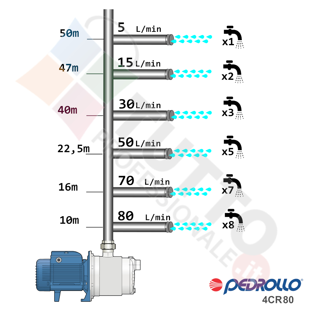 Questa elettropompa serve a spingere l’acqua nell’impianto idrico. La pompa è realizzata da Pedrollo, una delle aziende leader nella produzione di elettropompe. Il modello 4CR 80 è un’elettropompa di superficie appartenente alla famiglia delle pompe centrifughe multigiranti silenziose. La pompa in questione grazie alla sua estrema affidabilità e silenziosità trova ottimo impiego per uso domestico, utile quindi per aumentare la pressione dell’acqua della vostra casa o altra abitazione e risulta indicata anche per il giardinaggio e quindi per irrigazione di orti, giardini, serre, prati ed altre applicazioni simili. La pompa è ideale quindi per aumentare la pressione in modo ottimale e costante, accoppiandola ad esempio ad alcuni presscontrol, piccoli serbatoi autoclavi o altri sistemi per il controllo della pressione da erogare.Essendo una pompa multigirante il rumore generato è molto basso, al suo interno troviamo più parti mobili dette giranti. Queste girando aspirando l’acqua dal tubo di aspirazione e trasferiscono all’acqua stessa l’energia generata dal loro movimento. Nel corpo pompa, dove si muove l’acqua spinta dalla forza generata dalle giranti, avviene l’aumento della pressione dell’acqua e viene espulsa con pressione elevata dalla bocca di uscita.Parlando della pompa centrifuga in questione precisiamo che va alimentata con una tensione trifase, ha una potenza in cavalli di 0,75 hp e la temperatura del liquido da pompare arriva fino a 40°C.Il corpo pompa è realizzato in ghisa ed internamente possiede girante e albero motore in acciaio inox, quindi tutti materiali particolarmente indicati per il corretto ed affidabile utilizzato dell’elettropompa, garantendo ottimo funzionamento e lunga durata nel tempo. L’installazione va effettuata in luoghi chiusi ben arieggiati o comunque protetti dalle intemperie in quanto la sua protezione certificata è di tipo IPX4.Per ulteriori informazioni tecniche consultare la scheda tecnica della pompa.