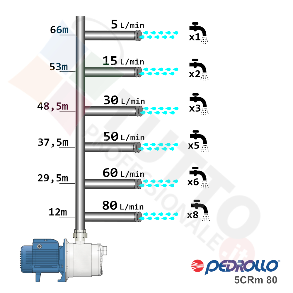 Questa elettropompa serve a spingere l’acqua nell’impianto idrico. La pompa è realizzata da Pedrollo, una delle aziende leader nella produzione di elettropompe. Il modello 5CRm 80 è un’elettropompa di superficie appartenente alla famiglia delle pompe centrifughe multigiranti silenziose. La pompa in questione grazie alla sua estrema affidabilità e silenziosità trova ottimo impiego per uso domestico, utile quindi per aumentare la pressione dell’acqua della vostra casa o altra abitazione e risulta indicata anche per il giardinaggio e quindi per irrigazione di orti, giardini, serre, prati ed altre applicazioni simili. La pompa è ideale quindi per aumentare la pressione in modo ottimale e costante, accoppiandola ad esempio ad alcuni presscontrol, piccoli serbatoi autoclavi o altri sistemi per il controllo della pressione da erogare.Essendo una pompa multigirante il rumore generato è molto basso, al suo interno troviamo più parti mobili dette giranti. Queste girando aspirando l’acqua dal tubo di aspirazione e trasferiscono all’acqua stessa l’energia generata dal loro movimento. Nel corpo pompa, dove si muove l’acqua spinta dalla forza generata dalle giranti, avviene l’aumento della pressione dell’acqua e viene espulsa con pressione elevata dalla bocca di uscita.Parlando della pompa centrifuga in questione precisiamo che va alimentata con una tensione monofase, ha una potenza in cavalli di 1 hp e la temperatura del liquido da pompare arriva fino a 40°C.Il corpo pompa è realizzato in ghisa ed internamente possiede girante e albero motore in acciaio inox, quindi tutti materiali particolarmente indicati per il corretto ed affidabile utilizzato dell’elettropompa, garantendo ottimo funzionamento e lunga durata nel tempo. L’installazione va effettuata in luoghi chiusi ben arieggiati o comunque protetti dalle intemperie in quanto la sua protezione certificata è di tipo IPX4.Per ulteriori informazioni tecniche consultare la scheda tecnica della pompa.