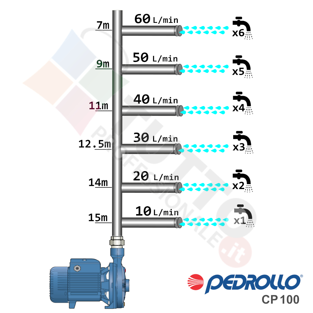 Questa elettropompa serve a spingere l’acqua nell’impianto idrico. La pompa CP100, realizzata dalla rinomata azienda italiana Pedrollo, è una elettropompa di superficie appartenente alla famiglia delle pompe centrifughe. Questa pompa centrifuga viene utilizzata in molteplici applicazioni per il pompaggio di acque pulite. Il suo utilizzo può essere di tipo domestico, civile e agricolo. Una pompa centrifuga è composta da una parte mobile detta girante, essa girando aspira l’acqua dal tubo di aspirazione e trasferisce all’acqua stessa l’energia generata dal suo movimento. Nel corpo pompa, dove si muove l’acqua spinta dalla forza generata dalla girante, avviene l’aumento della pressione dell’acqua e viene espulsa con pressione elevata dalla bocca di uscita.Questa elettropompa centrifuga risulta molto utile per aumentare quindi la pressione della vostra casa o altra abitazione ed infinte risulta indicata anche per il giardinaggio e quindi per irrigazione di orti, giardini, serre, prati ed altre applicazioni simili. La pompa è ideale quindi per aumentare la pressione in modo ottimale e costante, accoppiandola ad esempio ad alcuni presscontrol, piccoli serbatoi autoclavi o altri sistemi per il controllo della pressione da erogare.Parlando della pompa centrifuga in questione evidenziamo subito che va alimentata con una tensione trifase, ha una potenza in cavalli di 0,33 hp e la temperatura del liquido da pompare va da da -10 °C fino a +90 °C.Il corpo pompa è realizzato in ghisa ed internamente possiede una girante e un albero motore in acciaio inox, quindi tutti materiali particolarmente indicati per il corretto ed affidabile utilizzato dell’elettropompa, garantendo ottima resa e lunga durata nel tempo. L’installazione va effettuata in luoghi chiusi ben arieggiati o comunque protetti dalle intemperie in quanto la sua protezione certificata è di tipo IPX5.Per ulteriori informazioni tecniche consultare la scheda tecnica della pompa.