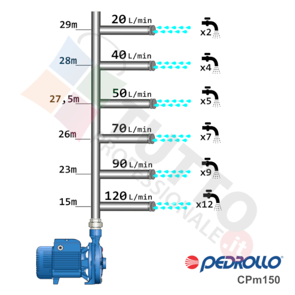 Questa elettropompa serve a spingere l’acqua nell’impianto idrico. La pompa CP150, realizzata dalla rinomata azienda italiana Pedrollo, è una elettropompa di superficie appartenente alla famiglia delle pompe centrifughe. Questa pompa centrifuga viene utilizzata in molteplici applicazioni per il pompaggio di acque pulite. Il suo utilizzo può essere di tipo domestico, civile e agricolo. Una pompa centrifuga è composta da una parte mobile detta girante, essa girando aspira l’acqua dal tubo di aspirazione e trasferisce all’acqua stessa l’energia generata dal suo movimento. Nel corpo pompa, dove si muove l’acqua spinta dalla forza generata dalla girante, avviene l’aumento della pressione dell’acqua e viene espulsa con pressione elevata dalla bocca di uscita.Questa elettropompa centrifuga risulta molto utile per aumentare quindi la pressione della vostra casa o altra abitazione ed infinte risulta indicata anche per il giardinaggio e quindi per irrigazione di orti, giardini, serre, prati ed altre applicazioni simili. La pompa è ideale quindi per aumentare la pressione in modo ottimale e costante, accoppiandola ad esempio ad alcuni presscontrol, piccoli serbatoi autoclavi o altri sistemi per il controllo della pressione da erogare.Parlando della pompa centrifuga in questione evidenziamo subito che va alimentata con una tensione trifase, ha una potenza in cavalli di 1 hp e la temperatura del liquido da pompare va da da -10 °C fino a +90 °C.Il corpo pompa è realizzato in ghisa ed internamente possiede una girante e un albero motore in acciaio inox, quindi tutti materiali particolarmente indicati per il corretto ed affidabile utilizzato dell’elettropompa, garantendo ottima resa e lunga durata nel tempo. L’installazione va effettuata in luoghi chiusi ben arieggiati o comunque protetti dalle intemperie in quanto la sua protezione certificata è di tipo IPX5.Per ulteriori informazioni tecniche consultare la scheda tecnica della pompa.