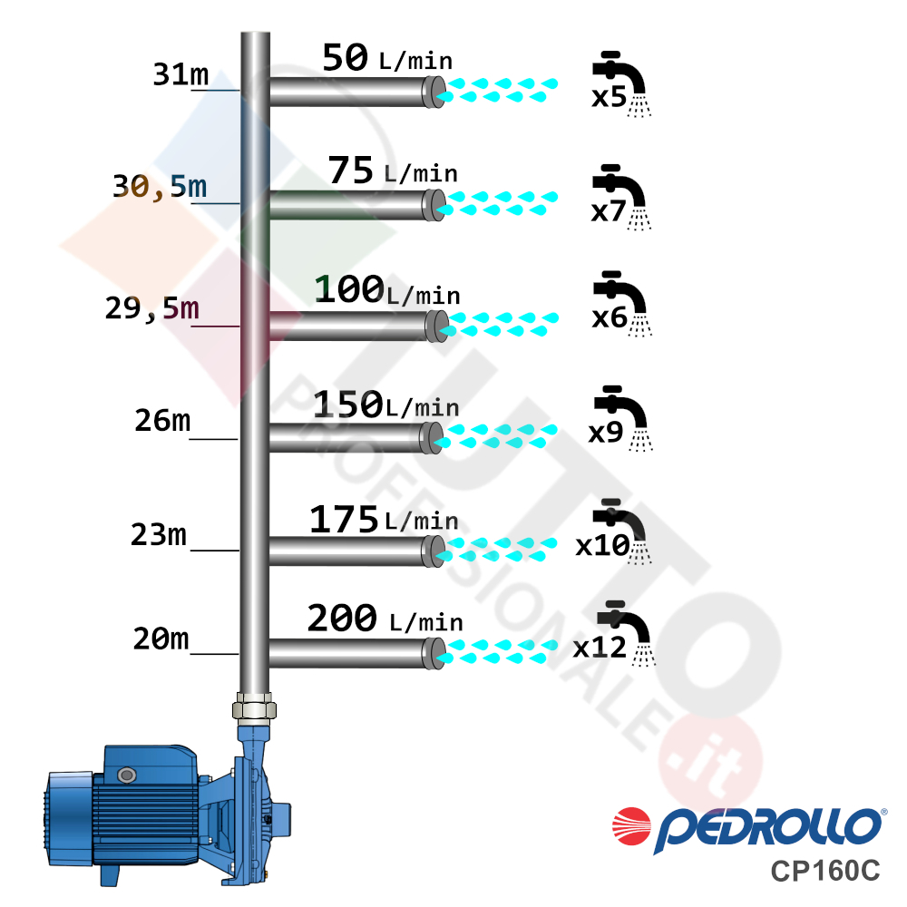 Questa elettropompa serve a spingere l’acqua nell’impianto idrico. La pompa CP160C, realizzata dalla rinomata azienda italiana Pedrollo, è una elettropompa di superficie appartenente alla famiglia delle pompe centrifughe. Questa pompa centrifuga viene utilizzata in molteplici applicazioni per il pompaggio di acque pulite. Il suo utilizzo può essere di tipo domestico, civile, industriale e agricolo. Una pompa centrifuga è composta da una parte mobile detta girante, essa girando aspira l’acqua dal tubo di aspirazione e trasferisce all’acqua stessa l’energia generata dal suo movimento. Nel corpo pompa, dove si muove l’acqua spinta dalla forza generata dalla girante, avviene l’aumento della pressione dell’acqua e viene espulsa con pressione elevata dalla bocca di uscita.Questa elettropompa centrifuga risulta molto utile per aumentare quindi la pressione della vostra casa o altra abitazione, ma è anche indicata per uso industriale e quindi ideale ad un forte e continuo utilizzo, ed infinte risulta indicata anche per il giardinaggio e quindi per irrigazione di orti, giardini, serre, prati ed altre applicazioni simili. La pompa è ideale quindi per aumentare la pressione in modo ottimale e costante, accoppiandola ad esempio ad alcuni presscontrol, piccoli serbatoi autoclavi o altri sistemi per il controllo della pressione da erogare.Parlando della pompa centrifuga in questione evidenziamo subito che va alimentata con una tensione trifase, ha una potenza in cavalli di 1,5 hp e la temperatura del liquido da pompare va da da -10 °C fino a +90 °C.Il corpo pompa è realizzato in ghisa ed internamente possiede una girante e un albero motore in acciaio inox, quindi tutti materiali particolarmente indicati per il corretto ed affidabile utilizzato dell’elettropompa, garantendo ottima resa e lunga durata nel tempo. L’installazione va effettuata in luoghi chiusi ben arieggiati o comunque protetti dalle intemperie in quanto la sua protezione certificata è di tipo IPX5.Per ulteriori informazioni tecniche consultare la scheda tecnica della pompa.