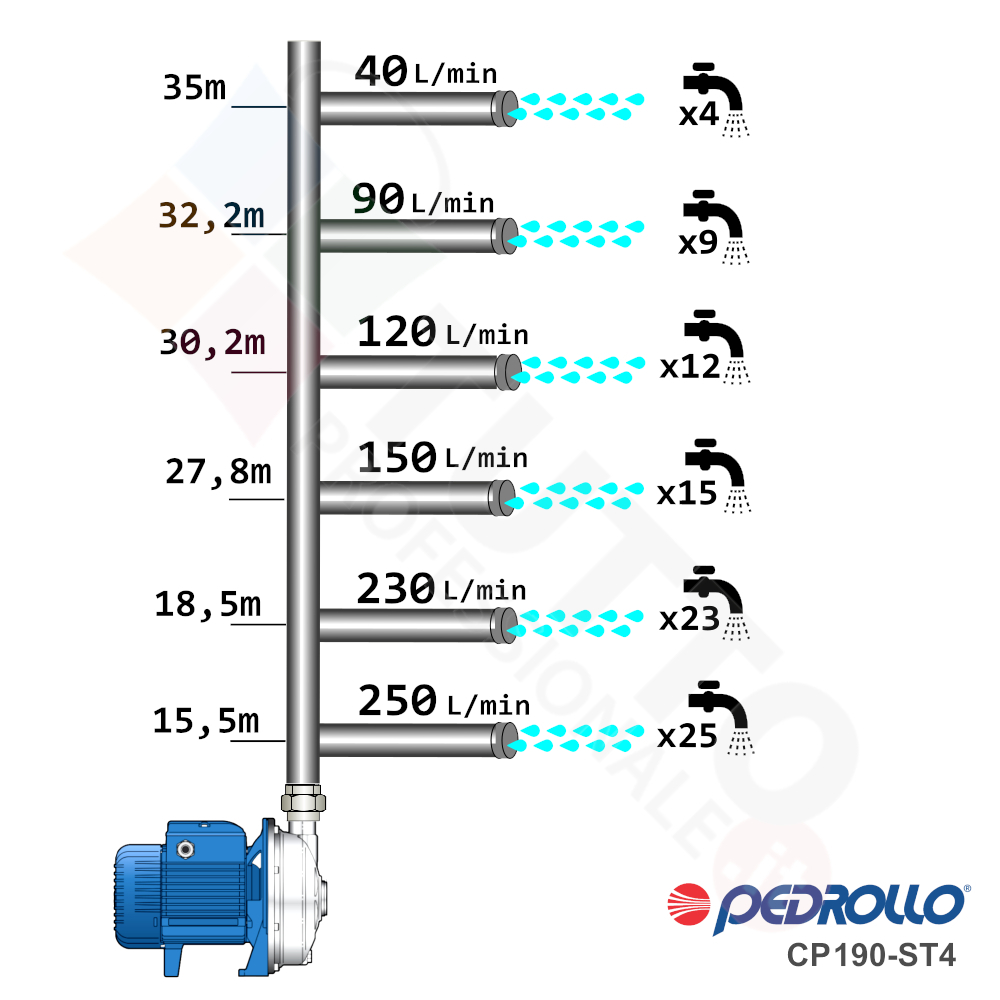Questa elettropompa serve a spingere l’acqua nell’impianto idrico. La pompa CP190-ST4 in acciaio INOX, realizzata dalla rinomata azienda italiana Pedrollo, è una elettropompa di superficie appartenente alla famiglia delle pompe centrifughe. Questa pompa centrifuga viene utilizzata in molteplici applicazioni per il pompaggio di acque pulite. Il suo utilizzo può essere di tipo domestico, industriale e agricolo. Una pompa centrifuga è composta da una parte mobile detta girante, essa girando aspira l’acqua dal tubo di aspirazione e trasferisce all’acqua stessa l’energia generata dal suo movimento. Nel corpo pompa, dove si muove l’acqua spinta dalla forza generata dalla girante, avviene l’aumento della pressione dell’acqua e viene espulsa con pressione elevata dalla bocca di uscita.Questa elettropompa centrifuga risulta molto utile per aumentare quindi la pressione della vostra casa o altra abitazione, ma è anche indicata per uso industriale e quindi ideale ad un forte e continuo utilizzo, ed infinte risulta indicata anche per il giardinaggio e quindi per irrigazione di orti, giardini, serre, prati ed altre applicazioni simili. La pompa è ideale quindi per aumentare la pressione in modo ottimale e costante, accoppiandola ad esempio ad alcuni presscontrol, piccoli serbatoi autoclavi o altri sistemi per il controllo della pressione da erogare.Parlando della pompa centrifuga in questione evidenziamo subito che va alimentata con una tensione trifase, ha una potenza in cavalli di 2 hp e la temperatura del liquido da pompare va da da -10 °C fino a +90 °C.Il corpo pompa è realizzato in Acciaio Inox ed internamente possiede una girante e un albero motore anche essi in acciaio inox, quindi tutti materiali particolarmente indicati per il corretto ed affidabile utilizzato dell’elettropompa, garantendo ottima resa e lunga durata nel tempo. L’installazione va effettuata in luoghi chiusi ben arieggiati o comunque protetti dalle intemperie in quanto la sua protezione certificata è di tipo IPX5.Per ulteriori informazioni tecniche consultare la scheda tecnica della pompa.