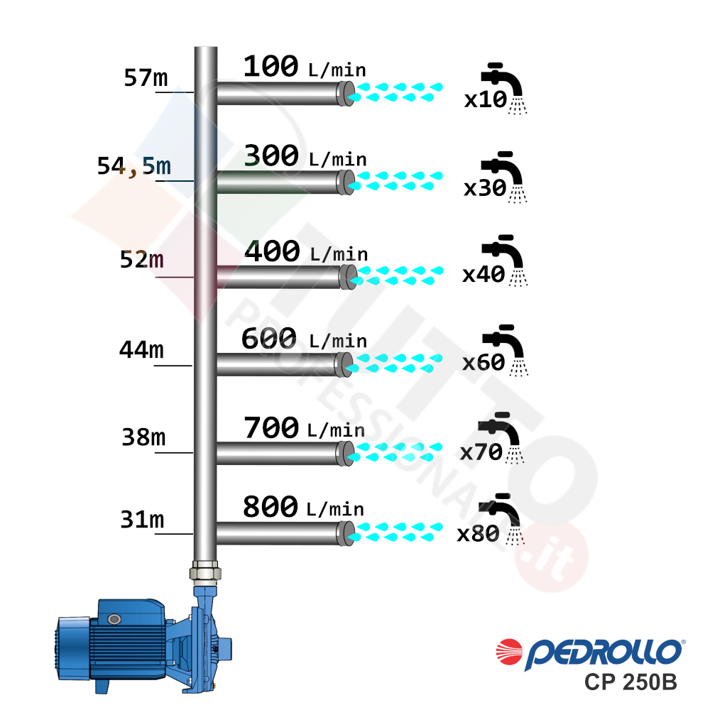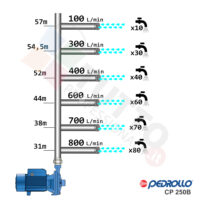 Questa elettropompa serve a spingere l’acqua nell’impianto idrico. La pompa CP250B, realizzata dalla rinomata azienda italiana Pedrollo, è una elettropompa di superficie appartenente alla famiglia delle pompe centrifughe. Questa pompa centrifuga viene utilizzata in molteplici applicazioni per il pompaggio di acque pulite. Il suo utilizzo può essere di tipo domestico, civile, industriale e agricolo. Una pompa centrifuga è composta da una parte mobile detta girante, essa girando aspira l’acqua dal tubo di aspirazione e trasferisce all’acqua stessa l’energia generata dal suo movimento. Nel corpo pompa, dove si muove l’acqua spinta dalla forza generata dalla girante, avviene l’aumento della pressione dell’acqua e viene espulsa con pressione elevata dalla bocca di uscita.Questa elettropompa centrifuga risulta molto utile per aumentare quindi la pressione della vostra casa o altra abitazione, ma è anche indicata per uso industriale e quindi ideale ad un forte e continuo utilizzo, ed infinte risulta indicata anche per il giardinaggio e quindi per irrigazione di orti, giardini, serre, prati ed altre applicazioni simili. La pompa è ideale quindi per aumentare la pressione in modo ottimale e costante, accoppiandola ad esempio ad alcuni presscontrol, piccoli serbatoi autoclavi o altri sistemi per il controllo della pressione da erogare.Parlando della pompa centrifuga in questione evidenziamo subito che va alimentata con una tensione trifase, ha una potenza in cavalli di 5,5 hp e la temperatura del liquido da pompare va da da -10 °C fino a +90 °C.Il corpo pompa è realizzato in ghisa ed internamente possiede una girante in ottone e l’albero motore in acciaio inox, quindi tutti materiali particolarmente indicati per il corretto ed affidabile utilizzato dell’elettropompa, garantendo ottima resa e lunga durata nel tempo. L’installazione va effettuata in luoghi chiusi ben arieggiati o comunque protetti dalle intemperie in quanto la sua protezione certificata è di tipo IPX5.Per ulteriori informazioni tecniche consultare la scheda tecnica della pompa.