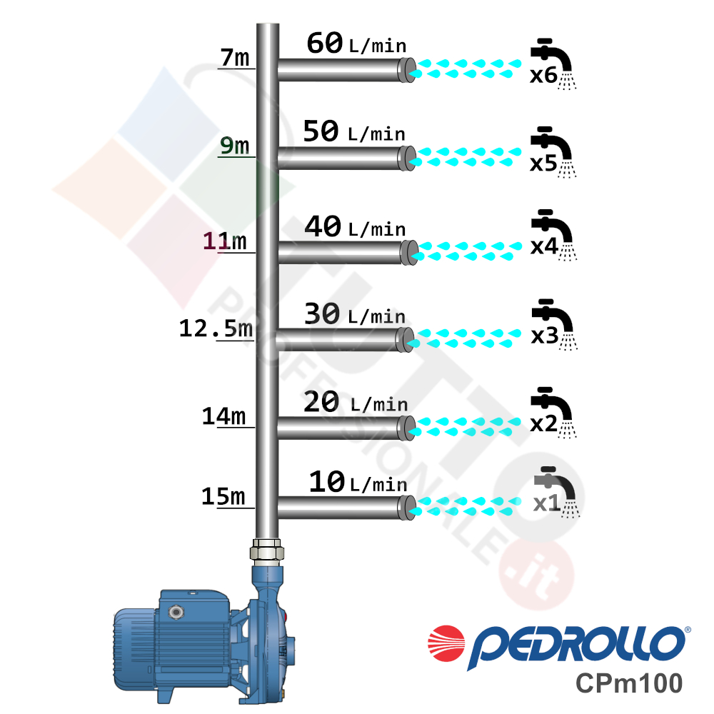 Questa elettropompa serve a spingere l’acqua nell’impianto idrico. La pompa CPm100, realizzata dalla rinomata azienda italiana Pedrollo, è una elettropompa di superficie appartenente alla famiglia delle pompe centrifughe. Questa pompa centrifuga viene utilizzata in molteplici applicazioni per il pompaggio di acque pulite. Il suo utilizzo può essere di tipo domestico, civile e agricolo. Una pompa centrifuga è composta da una parte mobile detta girante, essa girando aspira l’acqua dal tubo di aspirazione e trasferisce all’acqua stessa l’energia generata dal suo movimento. Nel corpo pompa, dove si muove l’acqua spinta dalla forza generata dalla girante, avviene l’aumento della pressione dell’acqua e viene espulsa con pressione elevata dalla bocca di uscita.Questa elettropompa centrifuga risulta molto utile per aumentare quindi la pressione della vostra casa o altra abitazione ed infinte risulta indicata anche per il giardinaggio e quindi per irrigazione di orti, giardini, serre, prati ed altre applicazioni simili. La pompa è ideale quindi per aumentare la pressione in modo ottimale e costante, accoppiandola ad esempio ad alcuni presscontrol, piccoli serbatoi autoclavi o altri sistemi per il controllo della pressione da erogare. Parlando della pompa centrifuga in questione evidenziamo subito che va alimentata con una tensione monofase, ha una potenza in cavalli di 0,33 hp e la temperatura del liquido da pompare va da da -10 °C fino a +90 °C.Il corpo pompa è realizzato in ghisa ed internamente possiede una girante e un albero motore in acciaio inox, quindi tutti materiali particolarmente indicati per il corretto ed affidabile utilizzato dell’elettropompa, garantendo ottima resa e lunga durata nel tempo. L’installazione va effettuata in luoghi chiusi ben arieggiati o comunque protetti dalle intemperie in quanto la sua protezione certificata è di tipo IPX5.Per ulteriori informazioni tecniche consultare la scheda tecnica della pompa.