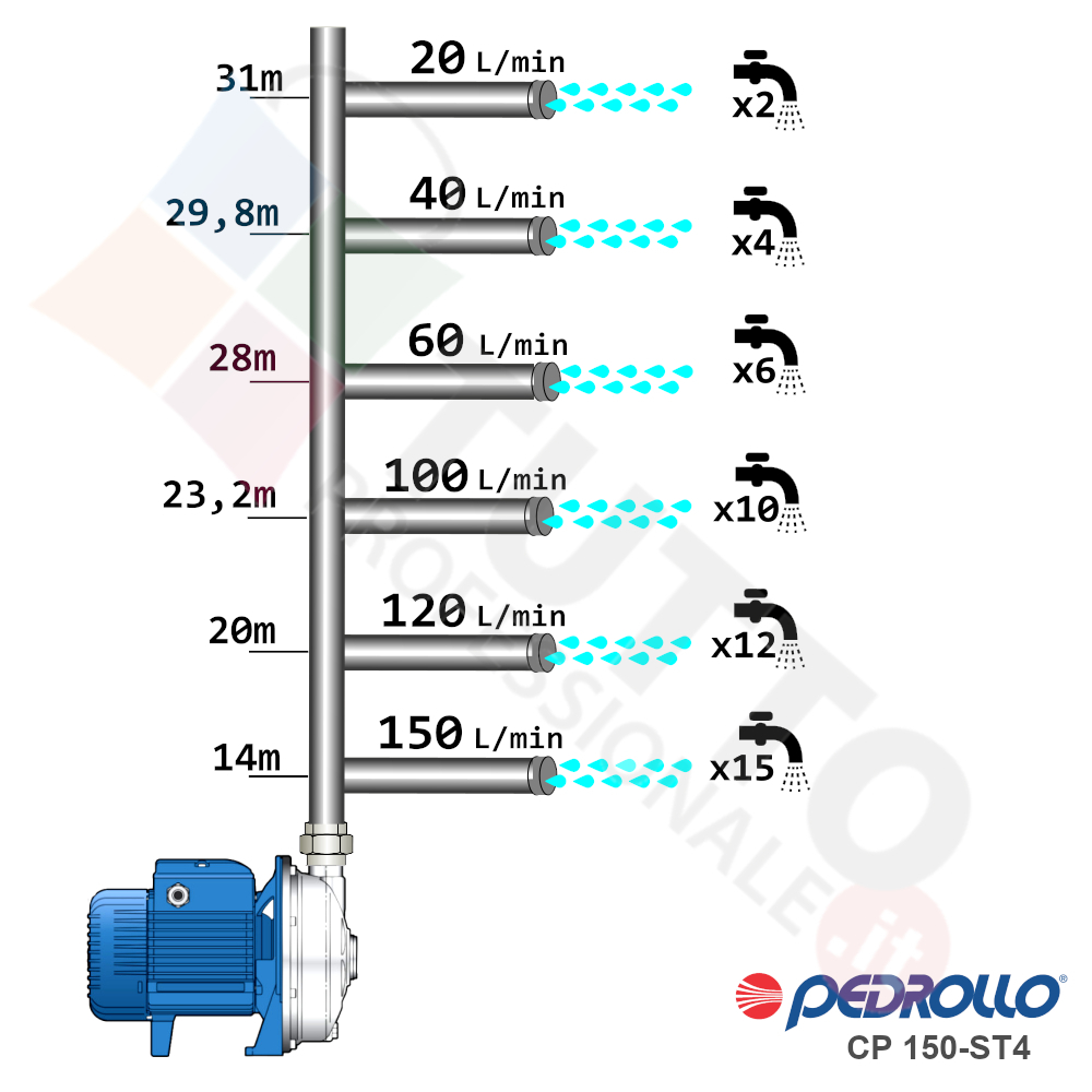 Questa elettropompa serve a spingere l’acqua nell’impianto idrico. La pompa CPm150-ST4 in acciaio INOX, realizzata dalla rinomata azienda italiana Pedrollo, è una elettropompa di superficie appartenente alla famiglia delle pompe centrifughe. Questa pompa centrifuga viene utilizzata in molteplici applicazioni per il pompaggio di acque pulite. Il suo utilizzo può essere di tipo domestico, industriale e agricolo. Una pompa centrifuga è composta da una parte mobile detta girante, essa girando aspira l’acqua dal tubo di aspirazione e trasferisce all’acqua stessa l’energia generata dal suo movimento. Nel corpo pompa, dove si muove l’acqua spinta dalla forza generata dalla girante, avviene l’aumento della pressione dell’acqua e viene espulsa con pressione elevata dalla bocca di uscita.Questa elettropompa centrifuga risulta molto utile per aumentare quindi la pressione della vostra casa o altra abitazione, ma è anche indicata per uso industriale e quindi ideale ad un forte e continuo utilizzo, ed infinte risulta indicata anche per il giardinaggio e quindi per irrigazione di orti, giardini, serre, prati ed altre applicazioni simili. La pompa è ideale quindi per aumentare la pressione in modo ottimale e costante, accoppiandola ad esempio ad alcuni presscontrol, piccoli serbatoi autoclavi o altri sistemi per il controllo della pressione da erogare.Parlando della pompa centrifuga in questione evidenziamo subito che va alimentata con una tensione monofase, ha una potenza in cavalli di 1 hp e la temperatura del liquido da pompare va da da -10 °C fino a +90 °C.Il corpo pompa è realizzato in Acciaio Inox ed internamente possiede una girante e un albero motore anche essi in acciaio inox, quindi tutti materiali particolarmente indicati per il corretto ed affidabile utilizzato dell’elettropompa, garantendo ottima resa e lunga durata nel tempo. L’installazione va effettuata in luoghi chiusi ben arieggiati o comunque protetti dalle intemperie in quanto la sua protezione certificata è di tipo IPX5.Per ulteriori informazioni tecniche consultare la scheda tecnica della pompa.