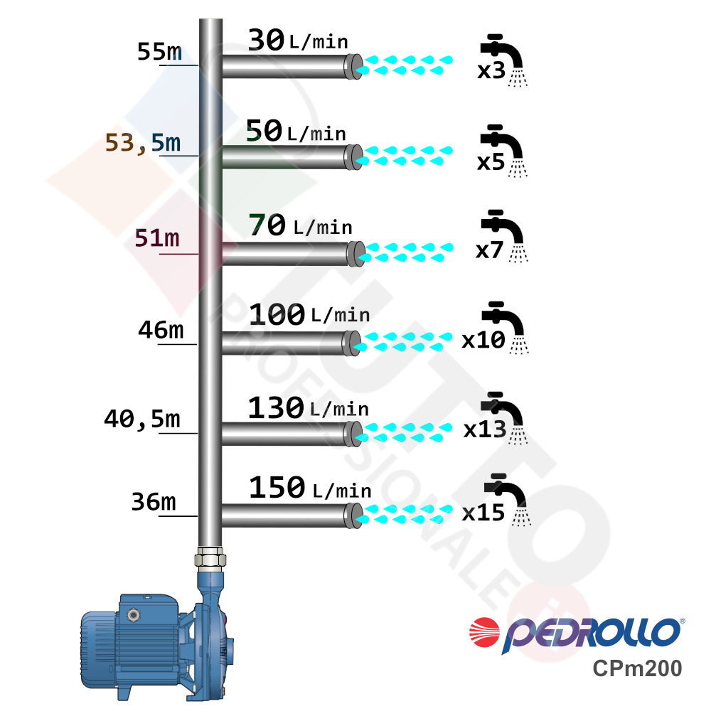 Questa elettropompa serve a spingere l’acqua nell’impianto idrico. La pompa CPm200, realizzata dalla rinomata azienda italiana Pedrollo, è una elettropompa di superficie appartenente alla famiglia delle pompe centrifughe. Questa pompa centrifuga viene utilizzata in molteplici applicazioni per il pompaggio di acque pulite. Il suo utilizzo può essere di tipo domestico, civile e agricolo. Una pompa centrifuga è composta da una parte mobile detta girante, essa girando aspira l’acqua dal tubo di aspirazione e trasferisce all’acqua stessa l’energia generata dal suo movimento. Nel corpo pompa, dove si muove l’acqua spinta dalla forza generata dalla girante, avviene l’aumento della pressione dell’acqua e viene espulsa con pressione elevata dalla bocca di uscita.Questa elettropompa centrifuga risulta molto utile per aumentare quindi la pressione della vostra casa o altra abitazione ed infinte risulta indicata anche per il giardinaggio e quindi per irrigazione di orti, giardini, serre, prati ed altre applicazioni simili. La pompa è ideale quindi per aumentare la pressione in modo ottimale e costante, accoppiandola ad esempio ad alcuni presscontrol, piccoli serbatoi autoclavi o altri sistemi per il controllo della pressione da erogare.Parlando della pompa centrifuga in questione evidenziamo subito che va alimentata con una tensione monofase, ha una potenza in cavalli di 3 hp e la temperatura del liquido da pompare va da da -10 °C fino a +90 °C.Il corpo pompa è realizzato in ghisa ed internamente possiede una girante e un albero motore in acciaio inox, quindi tutti materiali particolarmente indicati per il corretto ed affidabile utilizzato dell’elettropompa, garantendo ottima resa e lunga durata nel tempo. L’installazione va effettuata in luoghi chiusi ben arieggiati o comunque protetti dalle intemperie in quanto la sua protezione certificata è di tipo IPX5.Per ulteriori informazioni tecniche consultare la scheda tecnica della pompa.