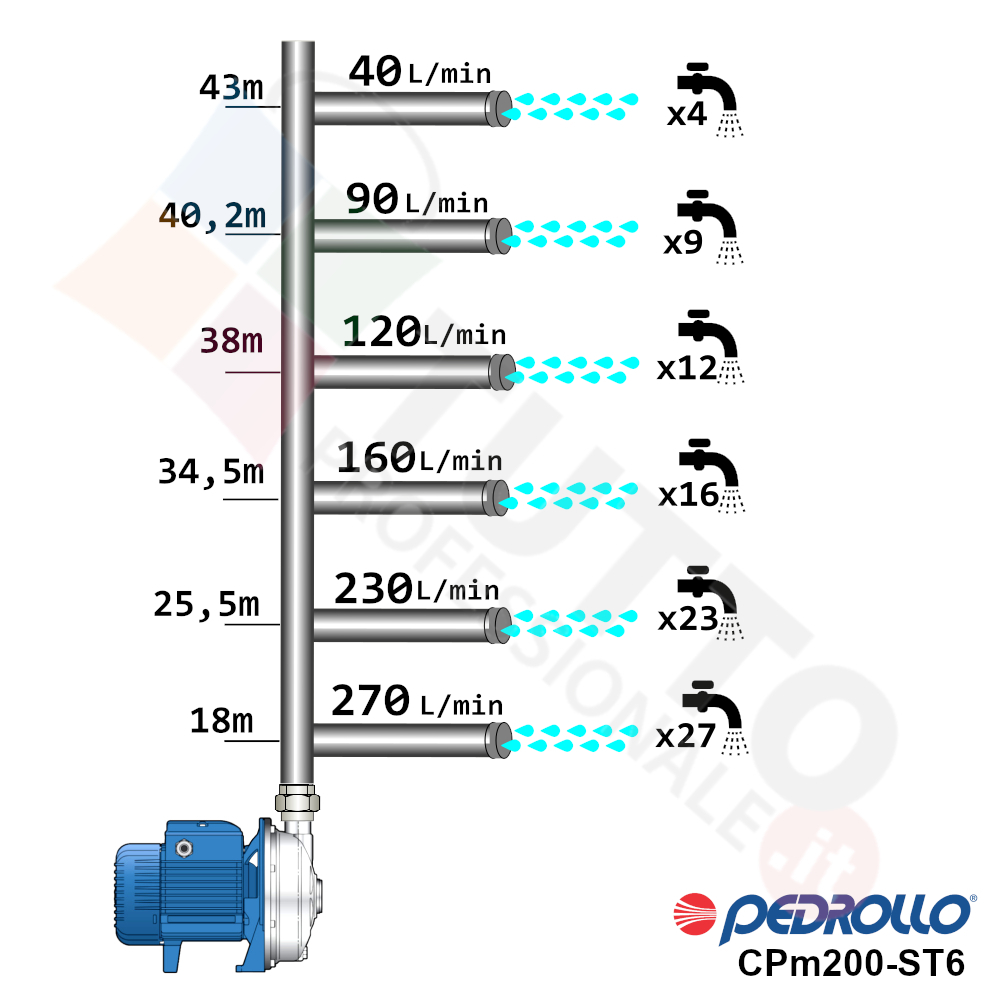 Questa elettropompa serve a spingere l’acqua nell’impianto idrico. La pompa CPm200-ST6 in acciaio INOX 316L, realizzata dalla rinomata azienda italiana Pedrollo, è una elettropompa di superficie appartenente alla famiglia delle pompe centrifughe. Questa pompa centrifuga viene utilizzata in molteplici applicazioni per il pompaggio di acque pulite. Il suo utilizzo può essere di tipo domestico, industriale e agricolo. Una pompa centrifuga è composta da una parte mobile detta girante, essa girando aspira l’acqua dal tubo di aspirazione e trasferisce all’acqua stessa l’energia generata dal suo movimento. Nel corpo pompa, dove si muove l’acqua spinta dalla forza generata dalla girante, avviene l’aumento della pressione dell’acqua e viene espulsa con pressione elevata dalla bocca di uscita.Questa elettropompa centrifuga risulta molto utile per aumentare quindi la pressione della vostra casa o altra abitazione, ma è anche indicata per uso industriale e quindi ideale ad un forte e continuo utilizzo, ed infinte risulta indicata anche per il giardinaggio e quindi per irrigazione di orti, giardini, serre, prati ed altre applicazioni simili. La pompa è ideale quindi per aumentare la pressione in modo ottimale e costante, accoppiandola ad esempio ad alcuni presscontrol, piccoli serbatoi autoclavi o altri sistemi per il controllo della pressione da erogare.Parlando della pompa centrifuga in questione evidenziamo subito che va alimentata con una tensione monofase, ha una potenza in cavalli di 3 hp e la temperatura del liquido da pompare va da da -10 °C fino a +90 °C.Il corpo pompa è realizzato in Acciaio Inox ed internamente possiede una girante e un albero motore anche essi in acciaio inox, quindi tutti materiali particolarmente indicati per il corretto ed affidabile utilizzato dell’elettropompa, garantendo ottima resa e lunga durata nel tempo. L’installazione va effettuata in luoghi chiusi ben arieggiati o comunque protetti dalle intemperie in quanto la sua protezione certificata è di tipo IPX5.Per ulteriori informazioni tecniche consultare la scheda tecnica della pompa.