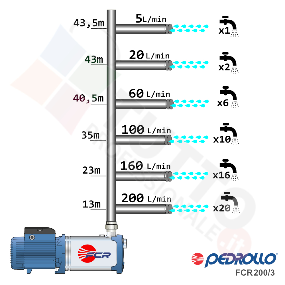 Questa elettropompa serve a spingere l’acqua nell’impianto idrico. La pompa FCR 200/3 è stata ideata e realizzata dall’italiana azienda Pedrollo, ed è utilizzata per il pompaggio di acqua pulita. Rappresenta una delle soluzioni migliori per risolvere il problema di bassa pressione di acqua nel vostro impianto. É un’elettropompa di superficie della famiglia multigiranti centrifughe, con la caratteristica di essere molto silenziosa ed il corpo e molti componenti interni sono in acciaio INOX. Grazie alla sua estrema affidabilità e silenziosità viene utilizzata per molteplici installazioni. Impiegata per uso domestico, utile quindi per aumentare notevolmente la pressione della vostra abitazione, casa, locale ed altre applicazioni simili. In più è ideale anche per uso civile, e quindi grazie alla sua potenza può. Ma nulla toglie che sia ottima per il giardinaggio e quindi perfetta per irrigazione di orti, giardini, serre, prati ed utilizzi appartenenti alla stessa categoria.Il funzionamento della pompa nell’aumentare la pressione del fluido, avviene tramite il sistema multigirante. Questo garantisce rumore molto basso e grazie alle giranti interne ed al loro movimento, nel corpo pompa, avviene l’aumento dell’acqua che viene aspirata dalla bocca di entrata. Una volta aumentata la pressione dell’acqua viene erogata tramite la bocca d’uscita con pressione aumentata.L’elettropompa autoclave si alimenta con tensione trifase, riesce ad erogare un potenza in cavalli di 1,5 hp garantendo una prevalenza fino a 43.5 metri.Il corpo pompa, coperchio, giranti, diffusori e albero motori sono tutti realizzati in acciaio INOX AISI 304, materiale particolarmente indicato per il corretto ed affidabile utilizzato dell’elettropompa, garantendo ottimo funzionamento e lunga durata nel tempo. L’installazione va effettuata in luoghi chiusi ben arieggiati o comunque protetti dalle intemperie in quanto la sua protezione certificata è di tipo IPX5.Per ulteriori informazioni tecniche consultare la scheda tecnica della pompa.