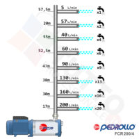 Questa elettropompa serve a spingere l’acqua nell’impianto idrico. La pompa FCRm200/4 è stata ideata e realizzata dall’italiana azienda Pedrollo, ed è utilizzata per il pompaggio di acqua pulita. Rappresenta una delle soluzioni migliori per risolvere il problema di bassa pressione di acqua nel vostro impianto. É un’elettropompa di superficie della famiglia multigiranti centrifughe, con la caratteristica di essere molto silenziosa ed il corpo e molti componenti interni sono in acciaio INOX. Grazie alla sua estrema affidabilità e silenziosità viene utilizzata per molteplici installazioni. Impiegata per uso domestico, utile quindi per aumentare notevolmente la pressione della vostra abitazione, casa, locale ed altre applicazioni simili. In più è ideale anche per uso civile, e quindi grazie alla sua potenza può. Ma nulla toglie che sia ottima per il giardinaggio e quindi perfetta per irrigazione di orti, giardini, serre, prati ed utilizzi appartenenti alla stessa categoria.Il funzionamento della pompa nell’aumentare la pressione del fluido, avviene tramite il sistema multigirante. Questo garantisce rumore molto basso e grazie alle giranti interne ed al loro movimento, nel corpo pompa, avviene l’aumento dell’acqua che viene aspirata dalla bocca di entrata. Una volta aumentata la pressione dell’acqua viene erogata tramite la bocca d’uscita con pressione aumentata.L’elettropompa autoclave si alimenta con tensione trifase, riesce ad erogare un potenza in cavalli di 2 hp garantendo una prevalenza fino a 57.5 metri.Il corpo pompa, coperchio, giranti, diffusori e albero motori sono tutti realizzati in acciaio INOX AISI 304, materiale particolarmente indicato per il corretto ed affidabile utilizzato dell’elettropompa, garantendo ottimo funzionamento e lunga durata nel tempo. L’installazione va effettuata in luoghi chiusi ben arieggiati o comunque protetti dalle intemperie in quanto la sua protezione certificata è di tipo IPX5.Per ulteriori informazioni tecniche consultare la scheda tecnica della pompa.